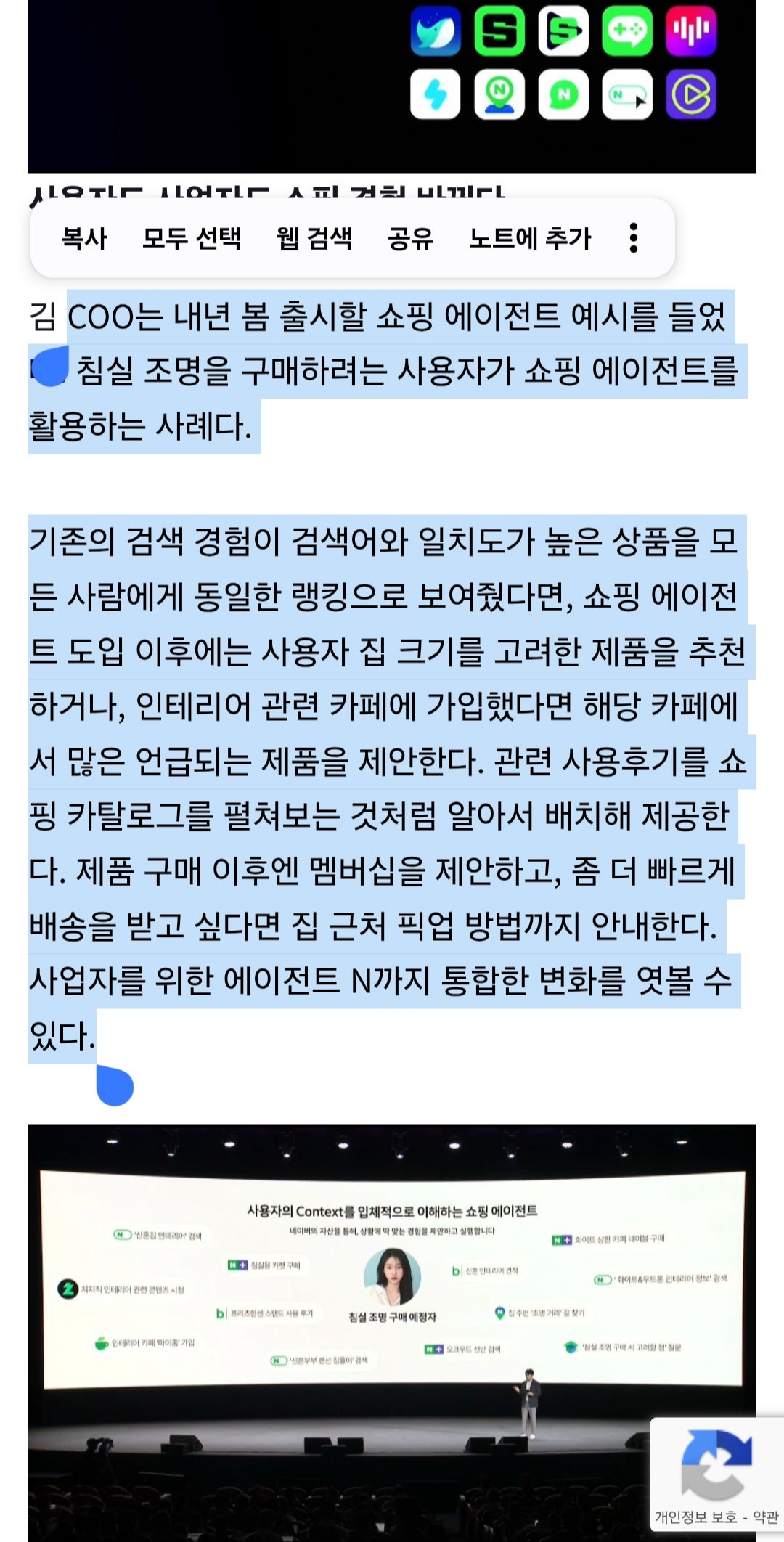 블로그, 카페, 리뷰, 언급, 구매 이력, 스토어의 일관성까지 알고리즘의 관리 대상이 됐다는 게 큰 특징이다. 쇼핑 플랫폼 내의 리뷰나 스토어 내의 콘텐츠를 분석해 상품을 추천해 주는 AI는 월마트도 아마존도 할 수 있지만, 쇼핑 밖의 블로그와 카페, 지식인까지 에이전트N의 소스가 된다는 점. 네이버만이 할 수 있는 서비스가 아닐까 싶어 감탄이 나온다.