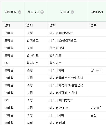 채널명 = 네이버 마케팅링크, 인스타그램, 네이버가격비교, 네이버플러스스토어 등의 채널명