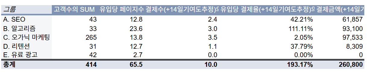 가장 많은 공수를 들였던 그룹 C(오가닉 마케팅)는 유입 비중의 상당 부분을 차지했다. 하지만 결제율은 2.05%로 최하위권이었다.