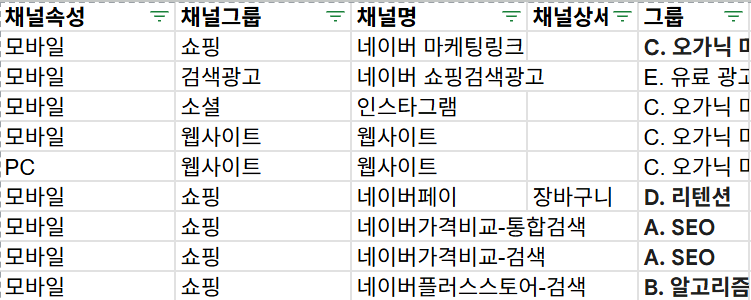 채널그룹 = 쇼핑, 소셜, 검색광고, 웹사이트, 검색 등..