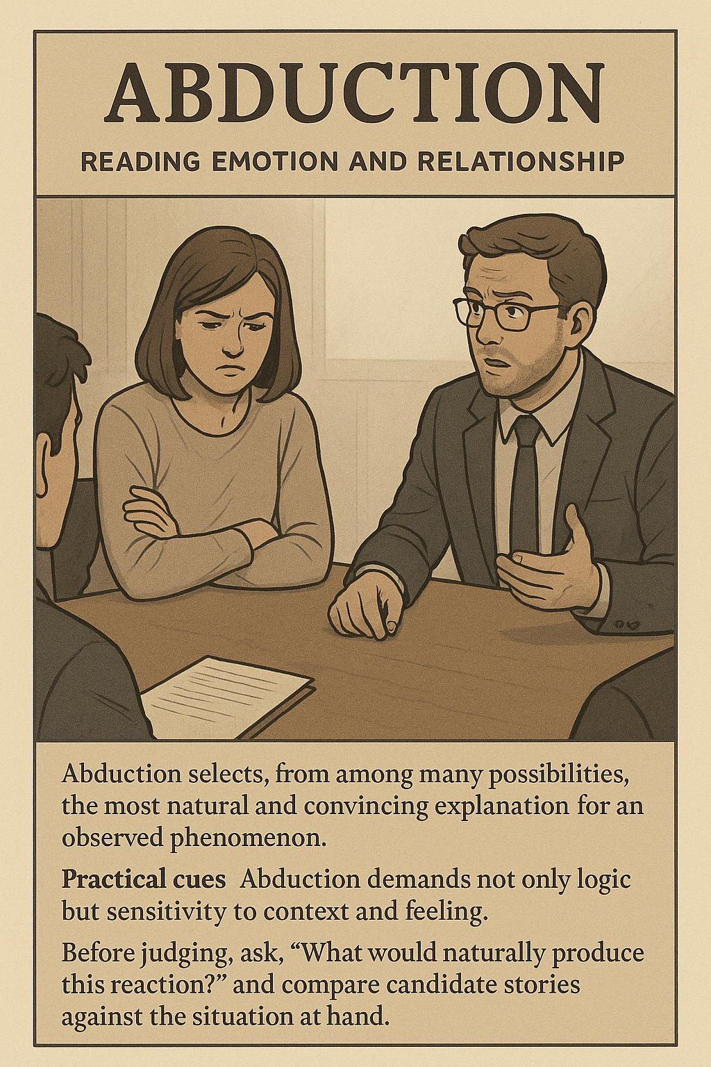 A teammate is silent throughout the meeting, replies curtly, avoids eye contact. Possible reasons abound: fatigue; personal issues; frustration with the direction; disappointment or hurt directed at you. Abduction chooses the most plausible account by weighing objective cues with context.