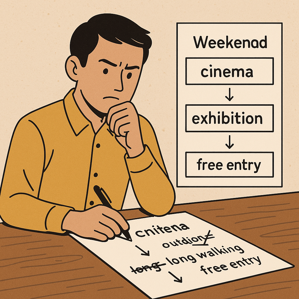 You’re planning the weekend. Three options left: cinema, exhibition, hiking. Conditions: