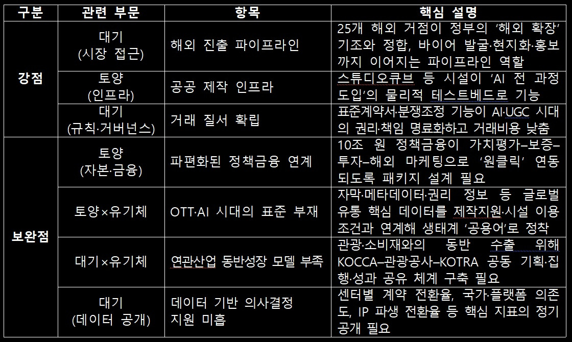대기와 유기체가 만나는 지점에서는 연관산업과의 동반성장 모델이 약하다. K-콘텐츠를 관광·소비재와 함께 묶어 수출하는 구조를 만들기 위해 KOCCA–한국관광공사–KOTRA가 기획·집행·성과 공유를 공동으로 수행하는 상시 협업 체계가 필요하다.