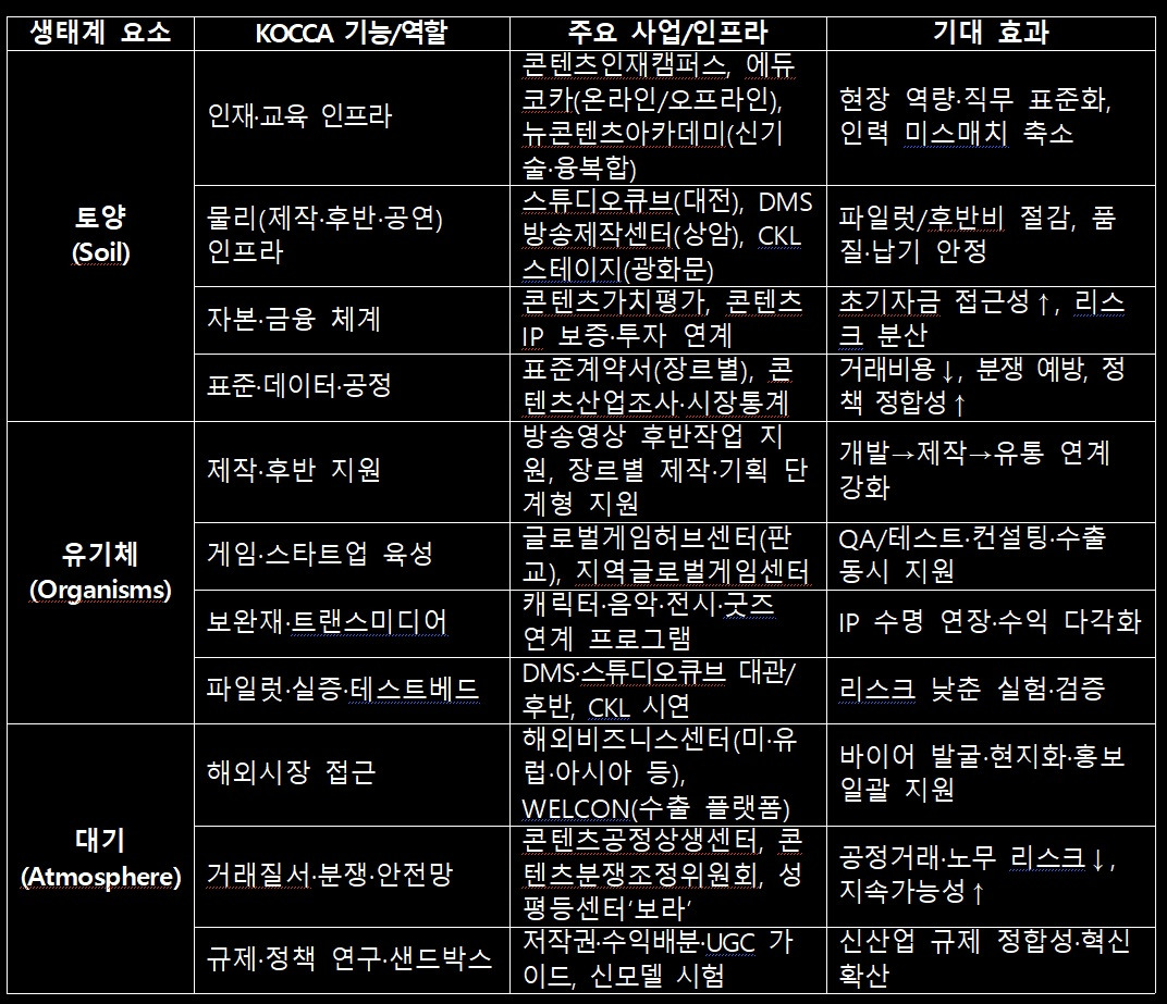 이러한 정책의 큰 방향과 KOCCA의 현재 기능·사업을 생태계 관점(토양–유기체–대기)에 포개어 보면, 무엇이 이미 잘 맞물려 돌아가고 무엇을 보완해야 하는지 또렷해진다.