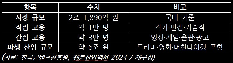 결국 웹툰 산업은 ▲콘텐츠 매출(2조 원 이상) ▲직접 고용(1만 명 규모) ▲간접 고용(3만 명 규모) ▲파생 산업 효과(6조 원 규모)라는 네 가지 측면에서 한국 경제와 문화산업의 중요한 성장 엔진으로 자리 잡았다.
