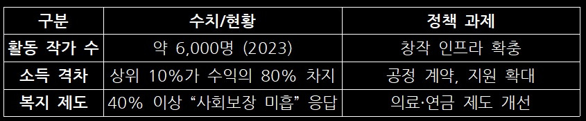 셋째, 의료·연금·보험 등 사회 안전망을 강화하여 창작자의 직업적 안정성을 높여야 한다. 현재 조사에 따르면 창작자의 40% 이상이 사회보장이 미흡하다고 응답한 바 있으며, 이는 장기적으로 인재 유출로 이어질 위험이 있다.