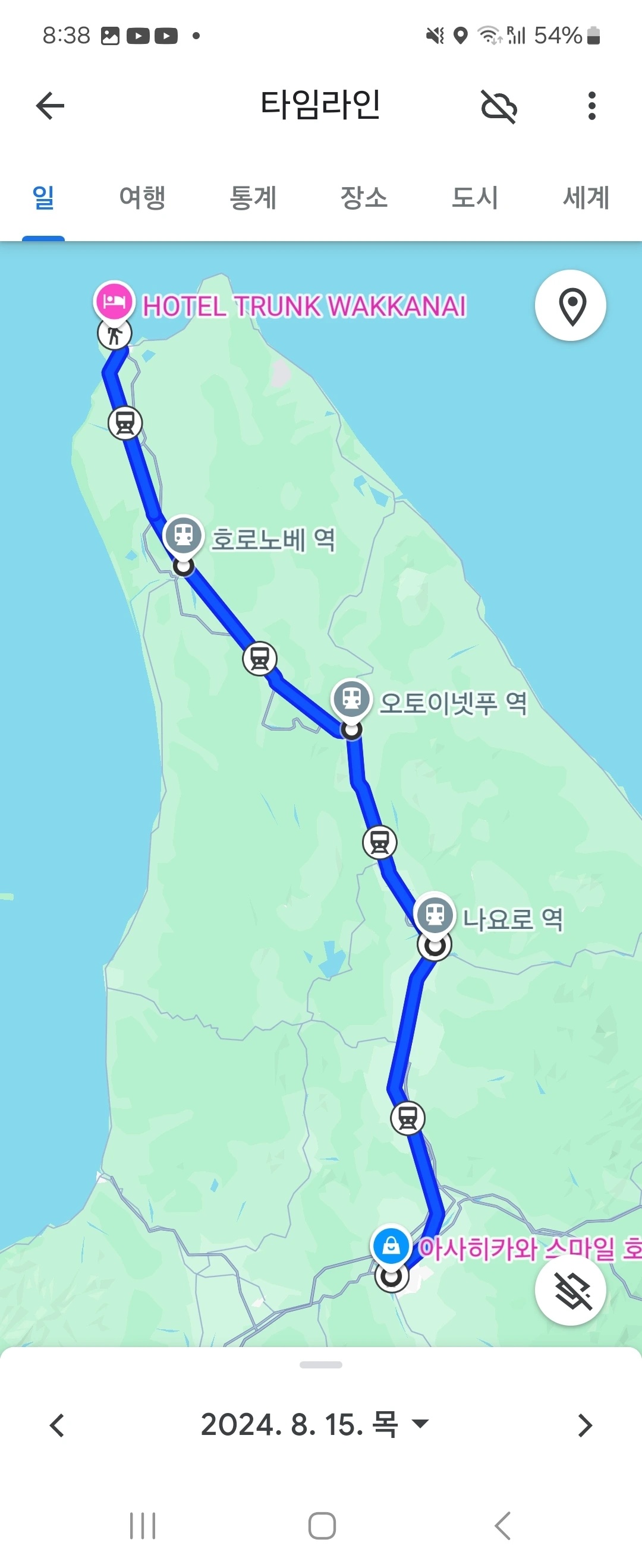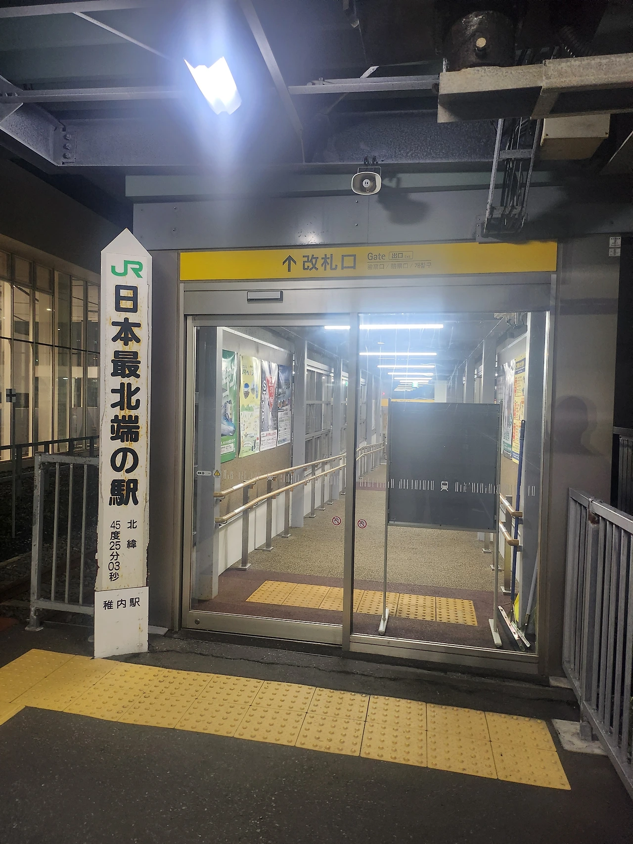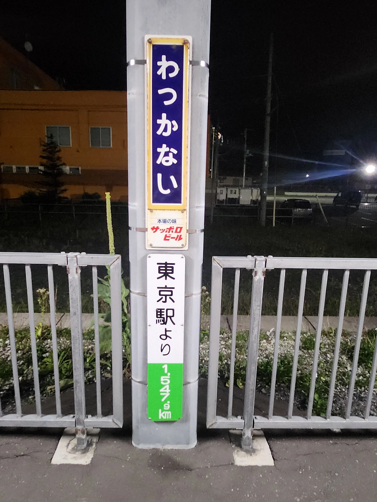 저녁 8시 왓카나이역에 도착했다. 북위 45도 25분 03초. 일본의 최북단에 위치한 역이다. 도쿄에서 1548km. 신아오모리-신하코다테는 불가피하게 신칸센을 탔지만, 비행기와 신칸센, 특급을 사용하지 않고, 보통 열차만으로 일본 최북단 도시 왓카나이까지 오는 데 성공했다. 참고로 한반도 최북단인 함경북도 온성군은 북위 43도, 그보다 더 북쪽인 곳이다.