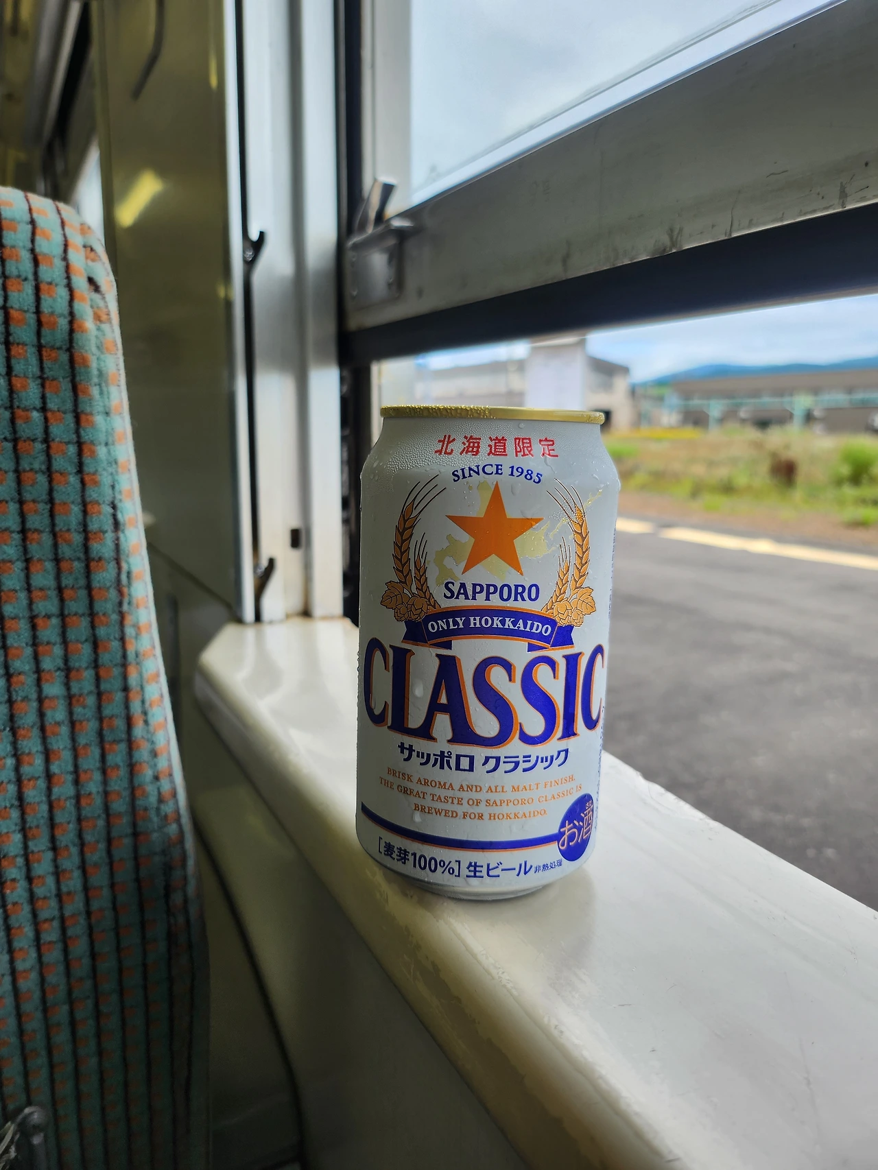 출발과 동시에 맥주 캔을 땄다. 일본 맥주 회사로는 아사히, 기린, 삿포로, 산토리가 유명한데, 이 중에서 삿포로는 이름 그대로 홋카이도 삿포로가 발상지다. 그래서 삿포로 클래식이라는 홋카이도에서만 판매하는 맥주가 있다. 맥주맛은 잘 모르지만, 홋카이도 한정판이라니 왠지 더 맛있는 느낌이 든다. 안주는 연어를 육포처럼 만든 어포.
