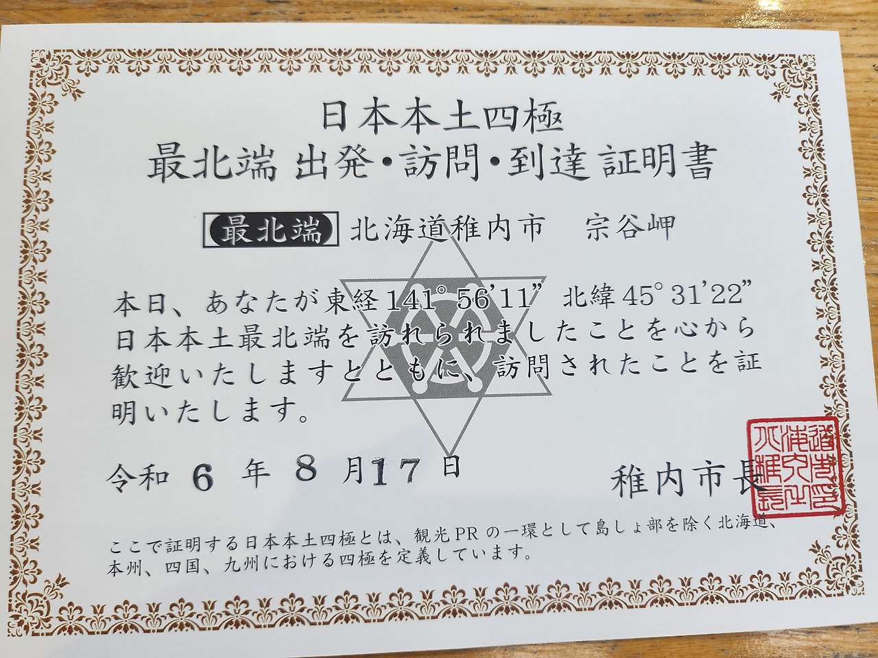 관광안내소에 가면 최북단증명서를 준다. 홋카이도 네무로(根室) 시에서는 최동단증명서, 나가사키(長崎)현 사세보(佐世保) 시에서는 최서단증명서, 가고시마(鹿児島)현 미나미오스미(南大隅) 초에서는 최남단증명서를 준다고 하니 네 곳 모두 가 봐야겠다는 목표가 생겼다. 사실 일본 최서단은 오키나와(沖縄)현에 있고, 최남단은 도쿄도 오가사와라(小笠原) 섬에 있지만, 본토(홋카이도, 혼슈, 시코쿠, 규슈)만 따지기에 나가사키와 가고시마에서 증명서를 발행한다고 한다.