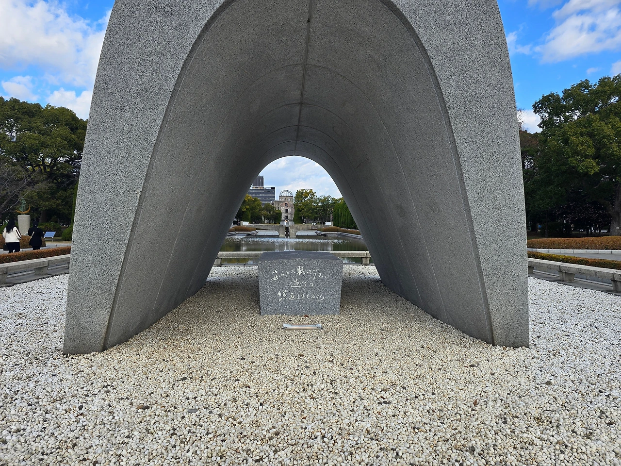 원폭 자료기념관 앞에는 "편히 쉬소서. 잘못은 되풀이하지 않겠습니다(安らかに眠って下さい。過ちは繰り返しませぬから)"라는 글이 새겨진 위령비가 있다.