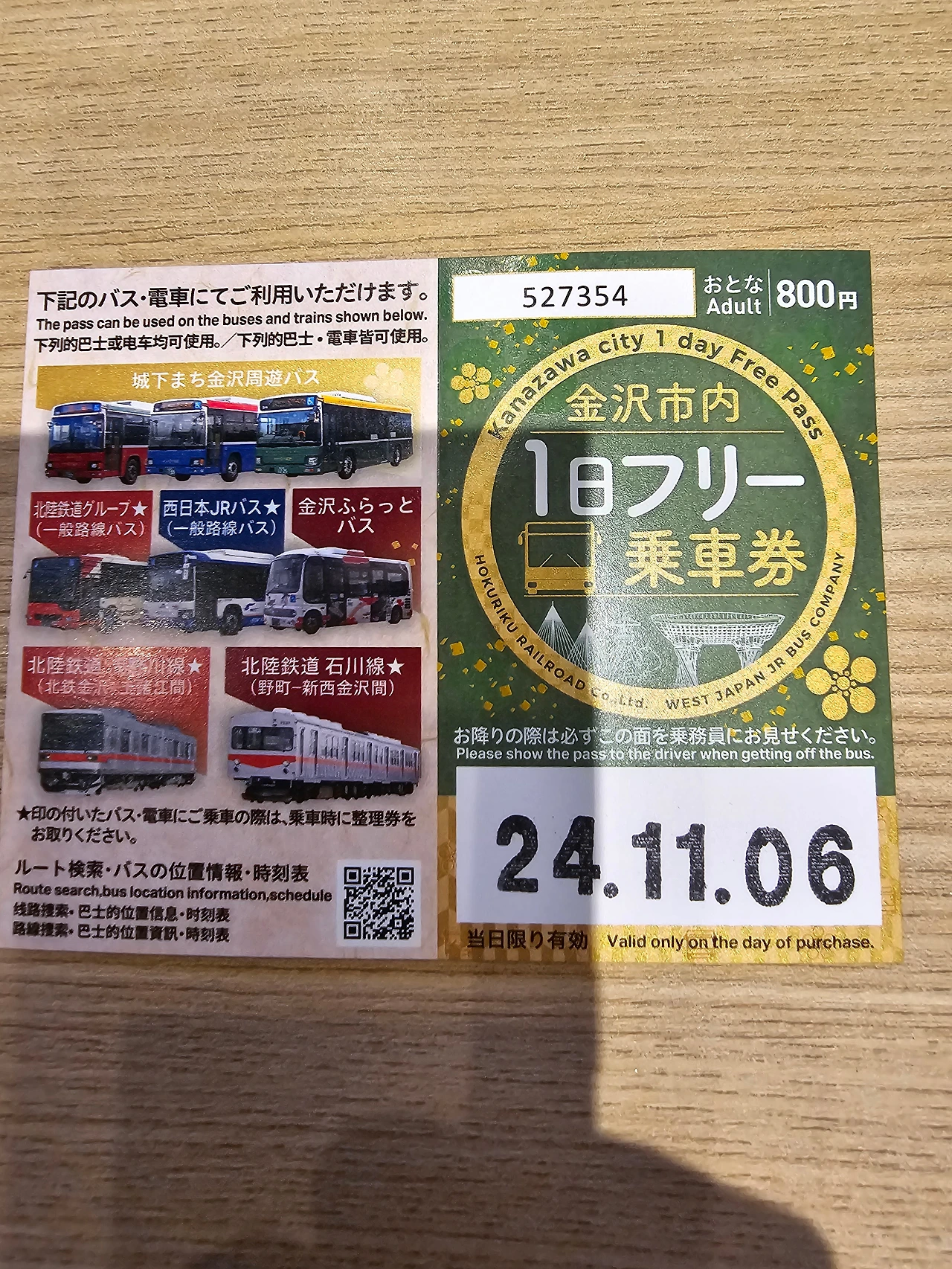 그런데 지난번에 갔을 때 버스 1일 승차권의 존재를 알게 되었다. 역에서 호텔로 가기 위해서 220엔을 쓰는 건 아깝지만, 하루에 네 번 이상 버스를 탄다면 800엔짜리 1일 승차권을 사는 게 이득인 것 같다. 가나자와 시내는 기본적으로 역에서 호텔 사이처럼 버스를 타기에는 아깝고 걸어 다니기에는 조금 애매한 거리가 많아서 1일 승차권을 사용하는 게 이득인 경우가 있다.