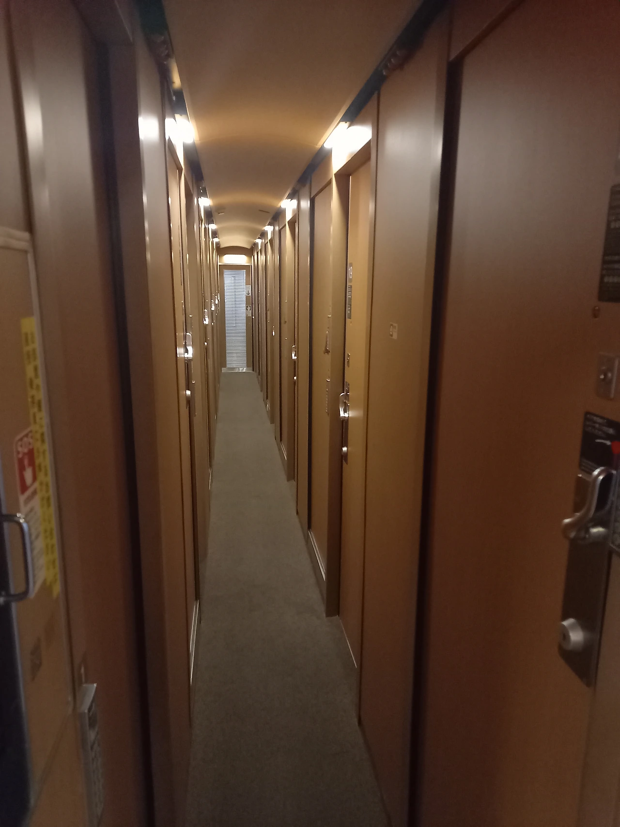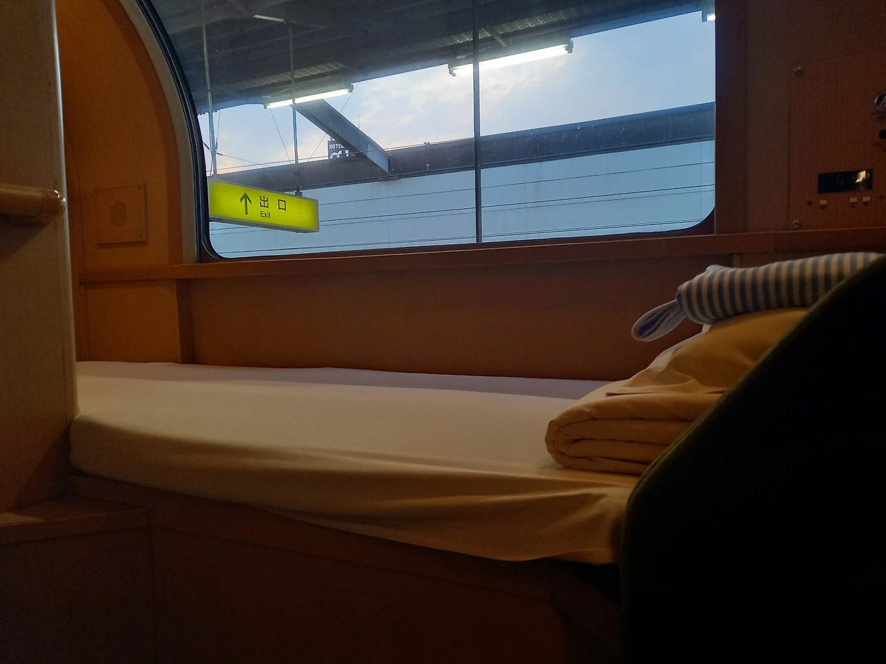 선라이즈 이즈모는 설비 등에 따라 몇 등급으로 나뉘는데 내가 탄 것은 솔로다. 대략 이런 느낌. 침대와 짐 놓을 공간이 있다. 화장실은 통로에 있고, 문은 비밀번호를 설정해서 잠글 수 있다.