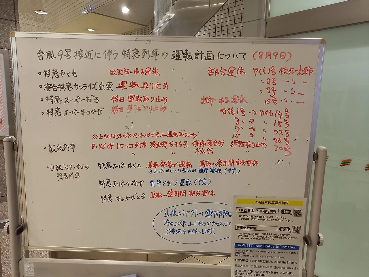 도쿄로 돌아올 때도 야간 특급 열차 선라이즈 이즈모를 탈 예정이었는데, 태풍으로 인해 운행이 취소되고 말았다. 다행히 도쿄로 가는 야간 버스는 운행 중이어서 버스를 타고 돌아왔다.