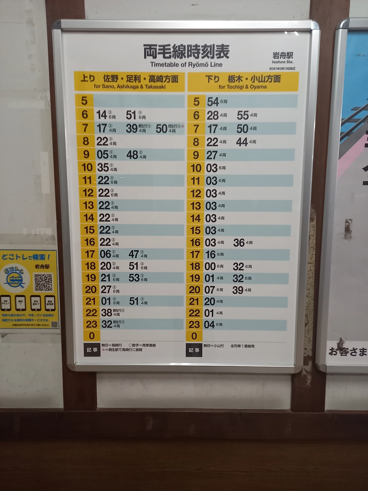이와후네 역의 시간표. 출퇴근 시간이 아니면 한 시간에 한 번 밖에 전철이 다니지 않는다. 일본에서도 시골에나 있는 역이다.