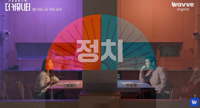 좌파vs우파, 페미니즘vs이퀄리즘('이퀄리즘'이라는 용어는 현재 젠더 학계에서 연구/학술 자료 근거가 전무한 용어로 방송에서 사용되어 논란이 있었다. 이에 동의하는 바, 이하 글에서는 '안티 페미니즘'이라 칭한다.), 서민vs부유, 개방vs전통. 이념 서바이벌 예능 프로그램 <사상검증구역: 더 커뮤니티>의 참가자들은 '커뮤니티 하우스'에 입주하기 전에 사상검증 테스트를 하고 (마치 MBTI처럼) 위의 4가지 척도에서 사상검증코드를 부여받는다. 이 프로그램의 핵심 규칙이 상대방의 사상검증코드를 추측해 상대방을 떨어뜨리는 것이었기 때문이다.