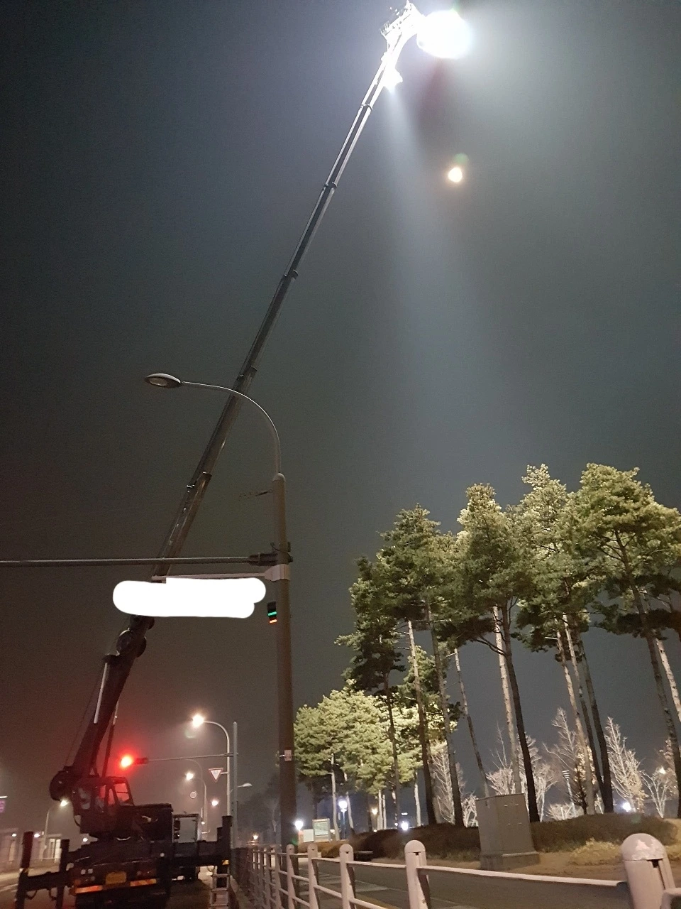 하늘에 띄워진 달(비싸요~~)보고 감탄할 시간도 없이 어두운 밤에 저 조명크레인을 혹시나 보지 못하고 사고가 날수 있으니 크레인 근처에서 차들의 통행을 원활하게 하기 위해 추위에 혼자서 오들오들 떨며 경광봉을 흔들고 있었어야 했다.