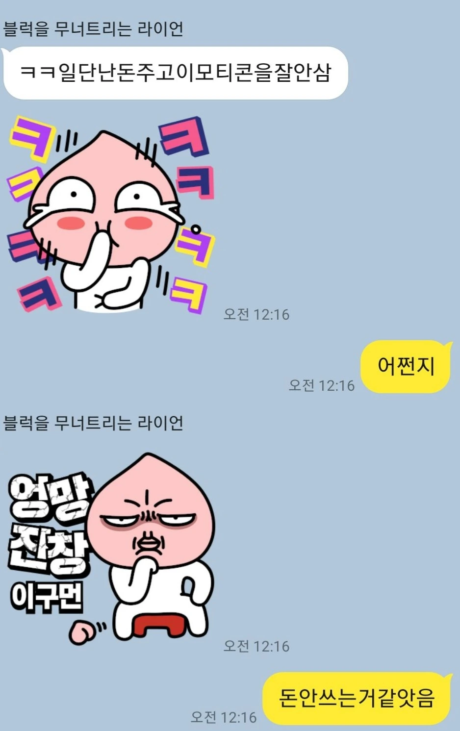 또 샀다. 카카오톡 이모티콘을 또 샀다. 세어보니 이제 30개 정도가 된다. 귀여워서, 웃겨서 샀는데, 막상 사고 보니 그 정도가 됐다. 이쯤 되면 이모티콘 부자다.