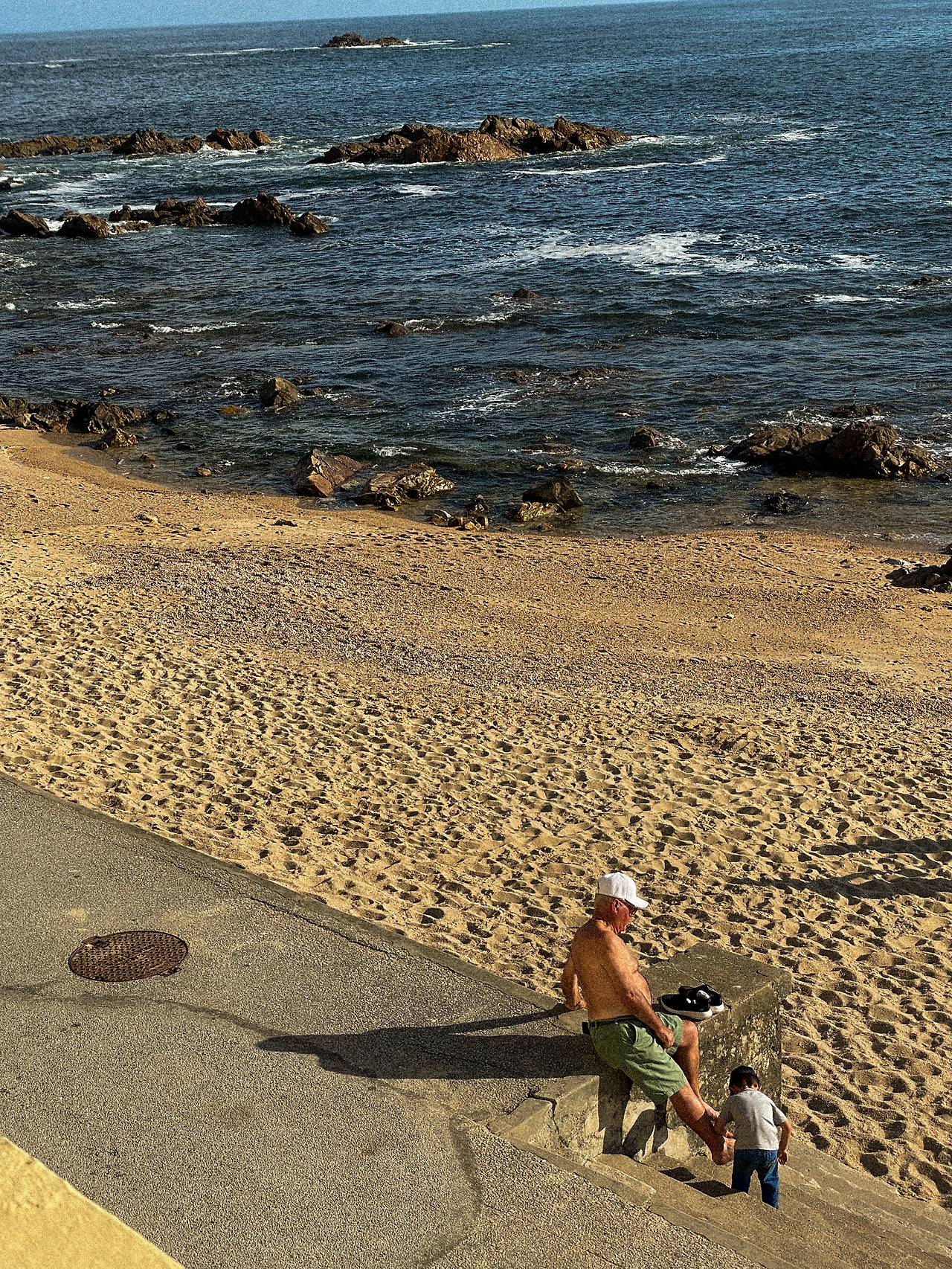 그러다 유독 한 할아버지와 손자가 나의 눈에 들어왔다. 계단에 걸터앉은 할아버지와 고사리 같은 손으로 할아버지의 발에 묻어있는 모래를 대신 털어주던 손자의 모습이 너무나도 정겨웠다.