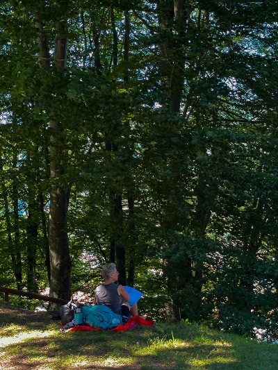 어르신은 들고 있던 책 한 문장을 읽고 앞에 펼쳐진 숲을 바라보고,