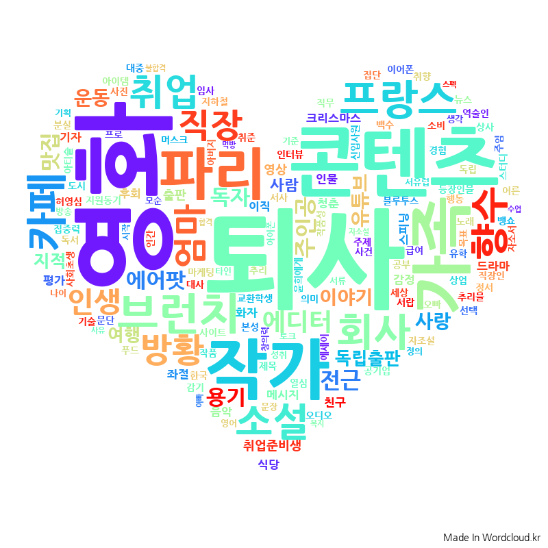우리가 그간 발행한 글들의 단어를 모아 워드 클라우드를 만들었다. 3부작으로 발행했던 인생 '영화' 콘텐츠 덕에 [영화]라는 키워드가 두드러진다. 자칭 타칭 파리 전문가인 에디터 부스러기의 파리 시리즈로 인해 '파리'도 눈에 띈다. 또한 부스러기와 도장쿠폰 에디터의 프랑스 유학 경험이 배어 나온 글들이 있어서인지 '프랑스'라는 단어도 볼 수 있다.