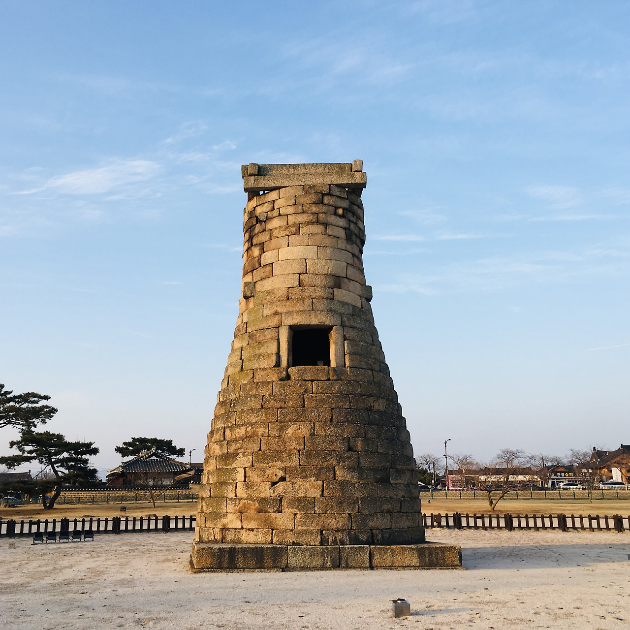 가장 먼저 도착한 곳은 첨성대였다! 사실 점심을 먹고 대릉원 구경을 가려했는데 어찌하다 보니 대릉원을 지나쳐 첨성대까지 왔다. 사진 찍기 좋은 핫플레이스라는 대릉원은 지나치면서 볼 수밖에 없었지만, 첨성대를 보자마자 '아! 내가 드디어 경주에 왔구나!'라고 느낄 수 있었다. 생각보다 컸고 너무 멋있었다. 책에서만 봤던 그 문화재가 내 눈앞에 있다는 것에 참 기분이 묘해지는 순간이었다. 아름다운 첨성대 덕분인지 하늘까지 완벽한 사진이었다.