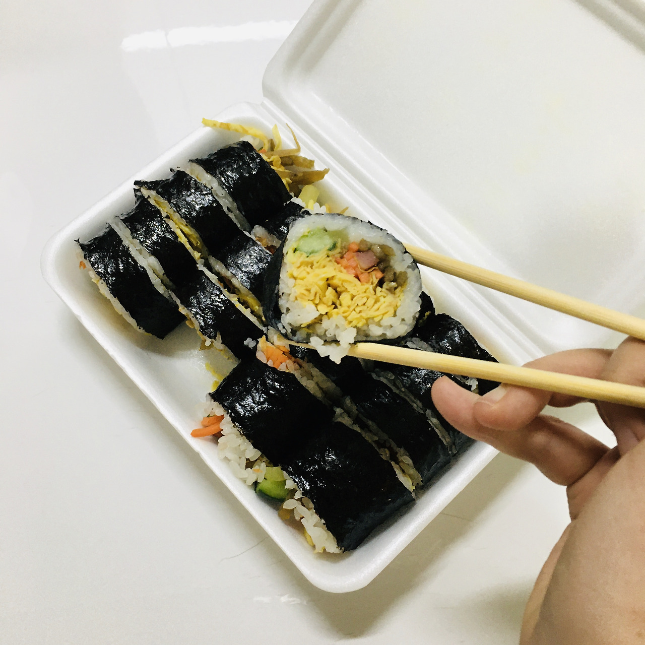 김밥 속에는 계란지단이 가득하다. 나는 딱히 크게 맛있는 김밥이라고 느끼진 못했다. 친구들은 맛있지만 오래 기다려서 먹을 정도는 아니고 바로 구입할 수 있다면 먹을 정도라는 평이 있었다.