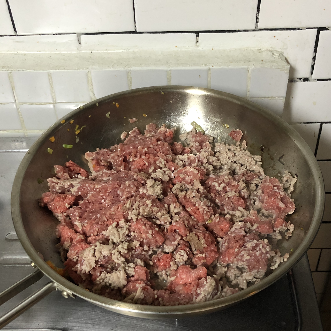 다짐육(돼지고기 혹은 소고기 한 종류만 써도 되지만 나는 두 종류를 섞어 썼다.)