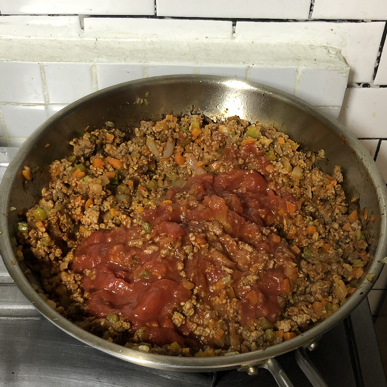 토마토 페이스트가 어느정도 섞였으면 홀 토마토도 넣어 준다.