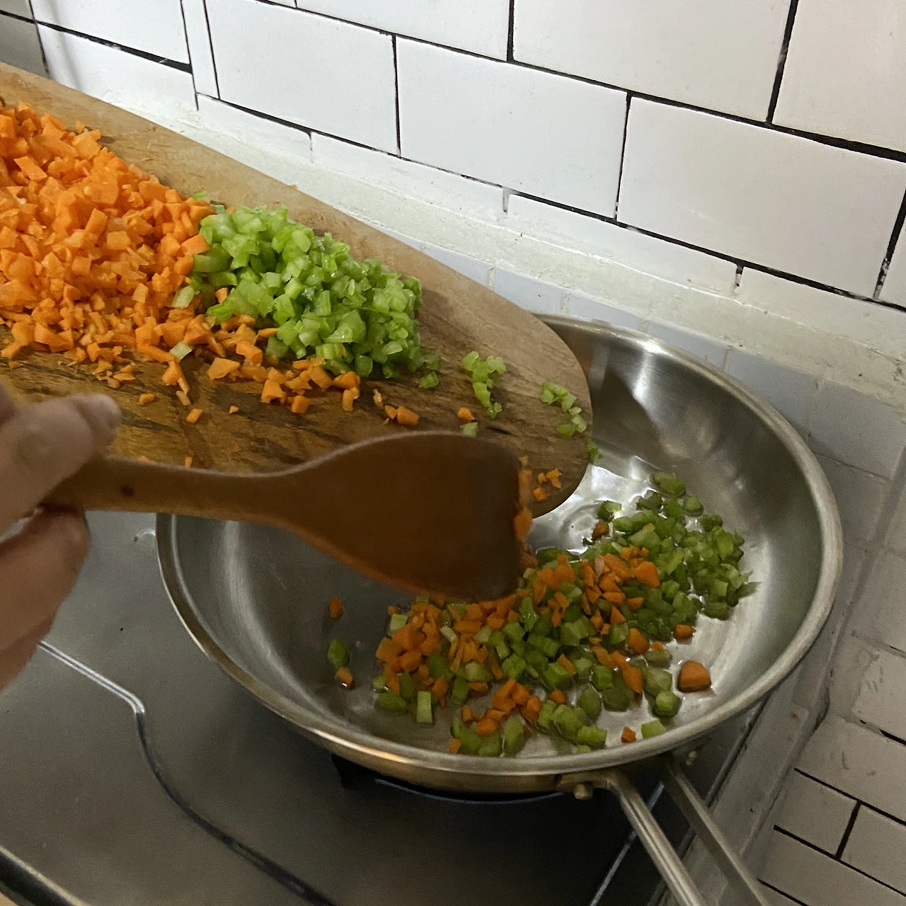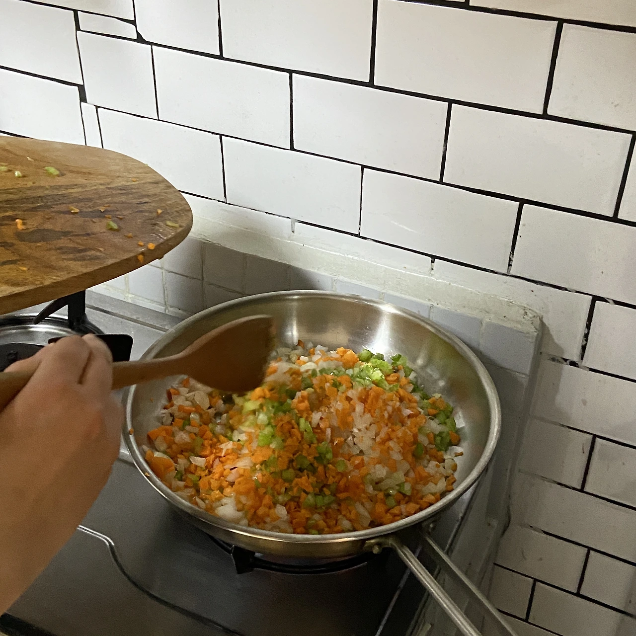 다진 야채는 올리브유를 두른 팬에 볶아 준다.