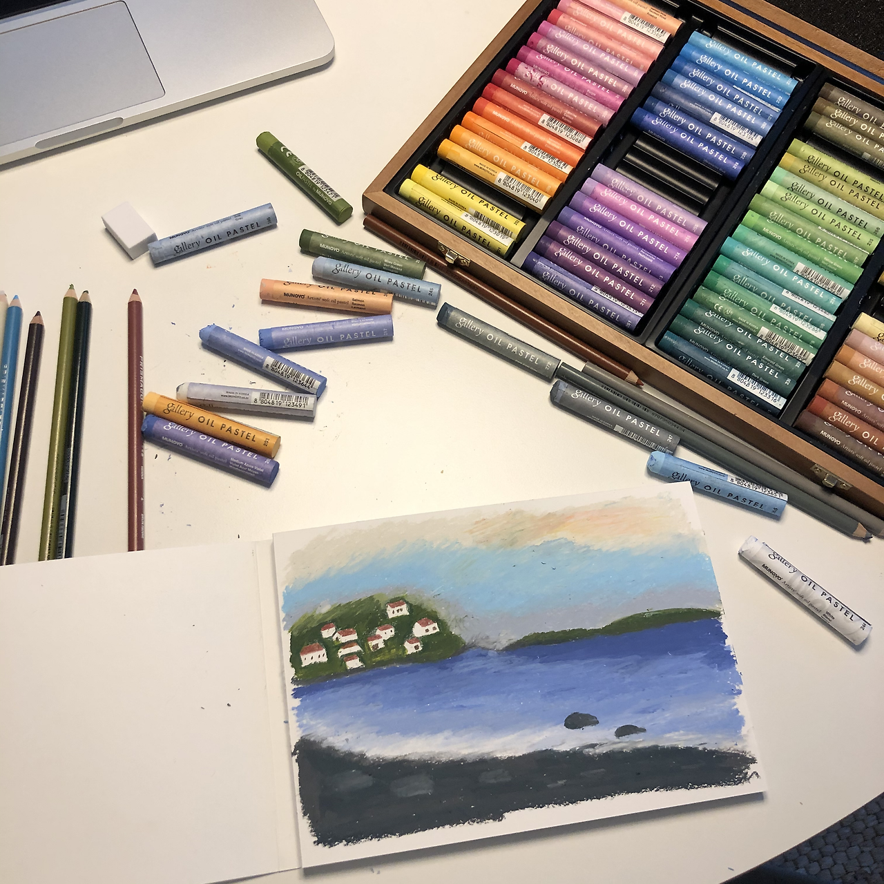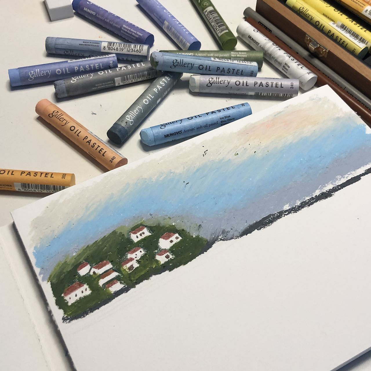 스케치가 완성되면 선생님의 안내에 따라 색을 칠하면 된다. 뭐 예술에 정해진 틀이 어딨겠냐고, 내가 원하는 느낌으로 적당히 칠해주면 되겠지 하는 안일한 마음으로 편안하게 하자. 클래스 명도 마음이 편안해지는 오일파스텔 풍경이던데, 하나하나 생각하면 마음이 불편해질 것 같더라.