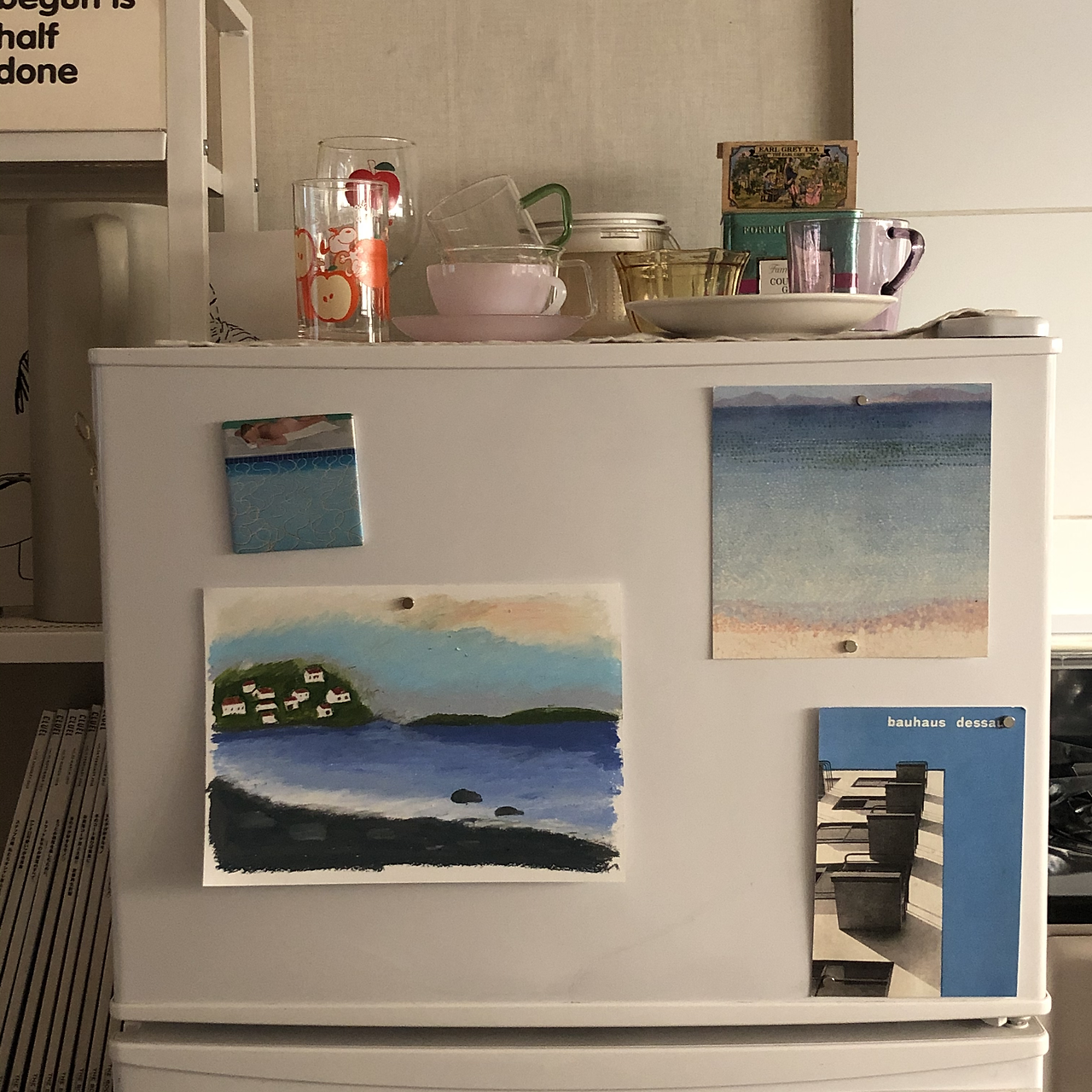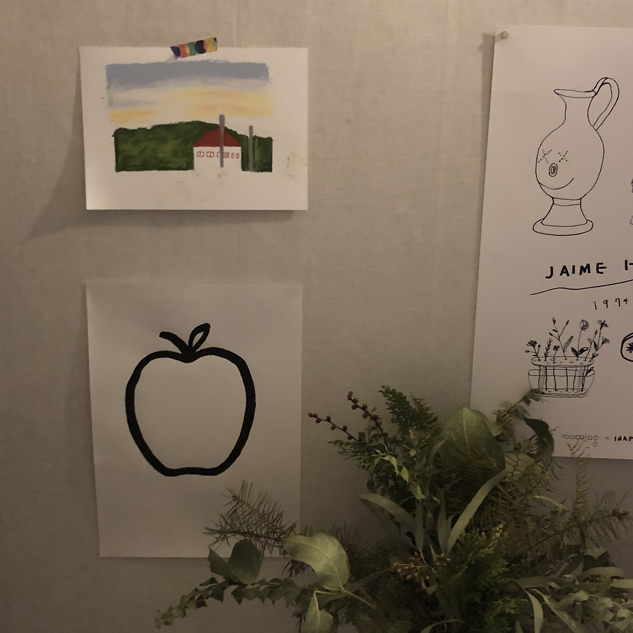 갑자기 내가 그린 그림에 애정이 솟구쳐서 냉장고에도 붙여보고, 벽 한쪽에도 붙여봤다. 이렇게 완성된 작품을 보고 있자니, 정말로 마음이 편안해지는 것 같기도 하고.