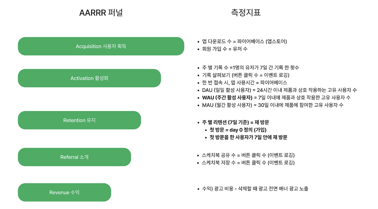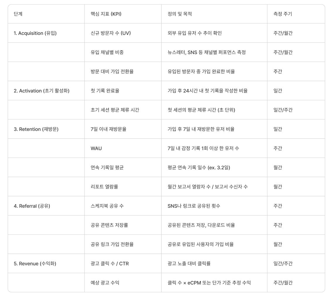 배포 전 AARRR 퍼널 구조를 공부하며 작성해 놓은 서비스 핵심 지표가 있었다.