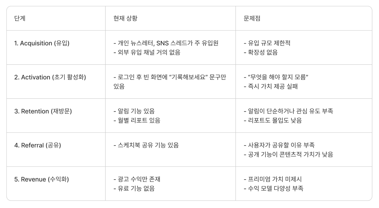 아직 “Acquisition (유입)” 단계에서 병목이 발생하고 있어요.