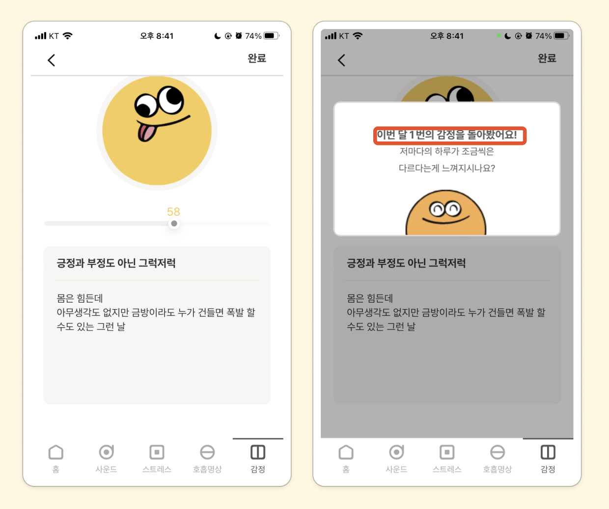 하지만 감정 상태 기록과 메모를 같이 했음에도 불구하고 결과로 감정 상태값만 나타나고, 메모를 다른 페이지의 리스트에서 확인해야만 한다면, 어디서 데이터를 확인해야 하는지 찾는 수고를 해야 할 것이다. 이런 수고는 사용자에게는 “일”이 되고, 일이 된 순간 앱에 대한 사용을 멈추게 된다.