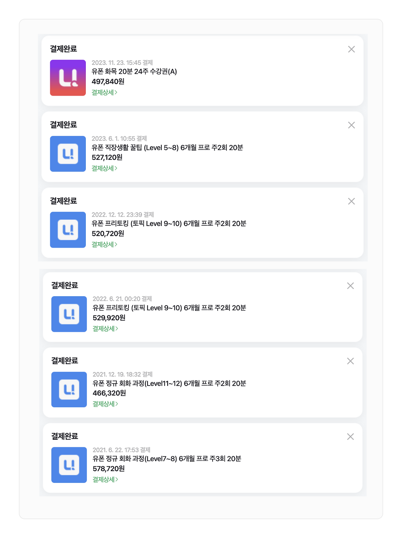 주 2회 20분 신청인데, 2번을 완벽하게 끝내는 날은 사실 드물지만.. 수업취소하면 쿠폰으로 보상해 주고, 다른 시간 되는 날에 쿠폰차감으로 수업을 진행할 수 있기에 쿠폰을 통으로 날려버리지 않기 위해 연장을 하고 있는 나.. 얼른 소진하고 이 개미지옥을 탈출하고 싶다 하핳.