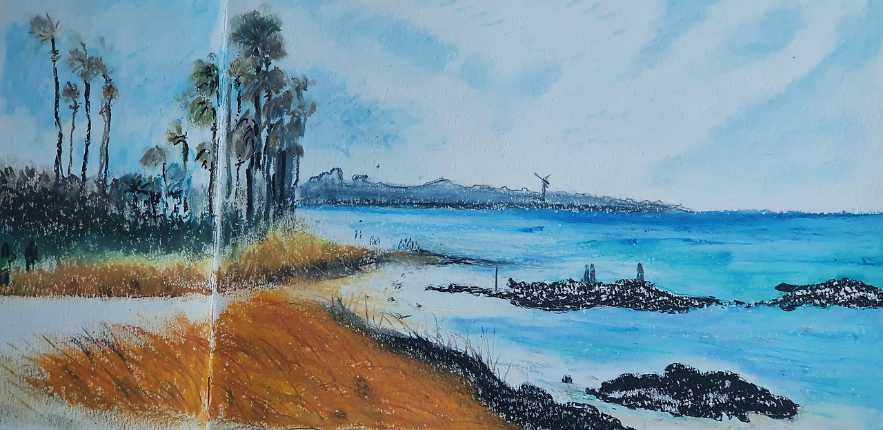 자전거도로는 아무래도 큰 도로를 끼고 있을 때가 많아서, 편의점 앞을 지나갈 때가 많았다. 그중 가장 인상적인 편의점이 두 곳이 있었다. 첫 번째 편의점은 편의점 입구에 돌하르방이 문지기처럼 서있었던 곳이고, 두 번째 편의점은 야외 탁자가 놓인 곳에 어른 주먹 두 개를 합한 것 같은 노란 하귤이 주렁주렁 달려있는 곳이다. 그 두 곳의 편의점주는 보지 못했어도, 보지 않아도 제주에 대한 남다른 애정이 느껴졌다. 체인점인 편의점에, 자신만의 개성을 표현하기는 쉽지 않다. 그건 그 사람만의 색이고, 감각이라고 생각한다. 그림도 그렇다. 같은 장소에서 같은 것을 그려도, 그리는 사람에 따라 그림의 분위기는 완전히 달라진다. 자신만의 표현방식이 다르고, 감각이 다르기 때문. 나 역시 그림을 그리면서 나만의 표현, 감각을 갖고 싶지만, 정말 마음처럼 되지 않아 지금도 노력 중이다.
