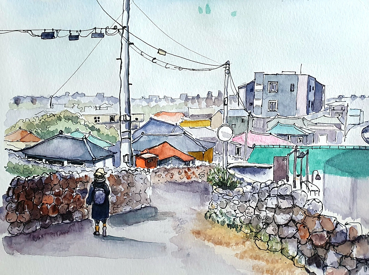 일찍 숙소를 나섰다. 원래 아침 일찍 송악산을 가야 했지만, 병원이 급선무였다. 버스를 타기 위해 차귀도 선착장이 있는 곳으로 향했다. 길가에 운동회가 열릴 때 만국기처럼 오징어가 널려 있었다. 어제 파스 사러 나갔던 딸은 파스는 없어서 못 사고 마른오징어를 사 왔던 것이 이해가 되었다. 천천히 걷는 내 속도에 맞춰 딸도 천천히 걸었다. 서울에선 창을 열고 맡는 텁텁한 공기였다면, 이곳 아침 공기는 상쾌하고, 더없이 맑았다. 버스 정류장 주변으로 오징어를 판다는 간판과 입간판이 정말 많았다. 오징어는 동해에서 나는 줄 알았는데 여기도 많이 잡히는 모양이었다. 방파제 쪽에도 아저씨 한 분이 열심히 물오징어를 널고 계셨다. 버스를 기다리는 동안 작은 어촌 마을 같은 이 마을을 천천히 한 번 돌아보았다. 마을 전체가 오징어와 깊은 관련이 있어 보였다.