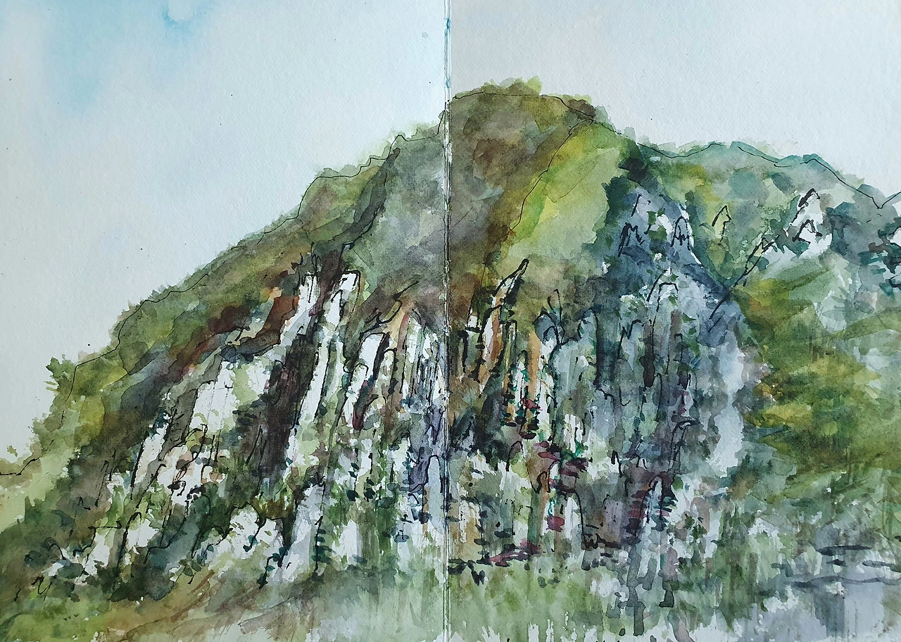 끊긴 핸드폰을 보는 내 마음은 불안, 초조로 인해 도저히 가만히 있을 수가 없었다. 그래서 가방에서 스케치북이랑 펜을 꺼냈다. 다른 곳에 집중해서 시간을 보내는 것에는 그림만큼 좋은 것은 없다. 마침 앉은자리 맞은편에 산방산도 있고. 그때의 나는 내가 할 수 있는 일이라곤 딸이 무사히 오리라 믿으며, 그림을 그리며 기다리는 일뿐이었다.