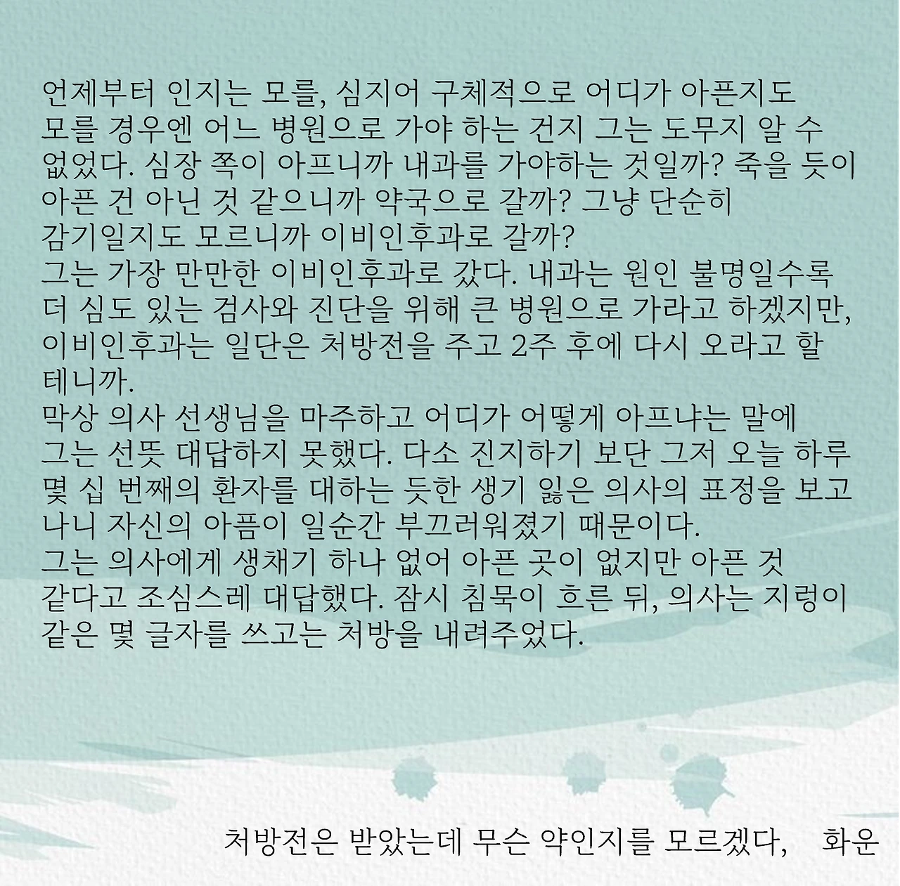 막상 의사 선생님을 마주하고 어디가 어떻게 아프냐는 말에 그는 선뜻 대답하지 못했다. 다소 진지하기 보단 그저 오늘 하루 몇 십 번째의 환자를 대하는 듯한 생기 잃은 의사의 표정을 보고 나니 자신의 아픔이 일순간 부끄러워졌기 때문이다.