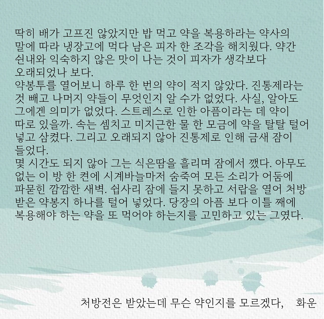 약봉투를 열어보니 하루 한 번의 약이 적지 않았다. 진통제라는 것 빼고 나머지 약들이 무엇인지 알 수가 없었다. 사실, 알아도 그에겐 의미가 없었다. 스트레스로 인한 아픔이라는 데 약이 따로 있을까. 속는 셈치고 미지근한 물 한 모금에 약을 탈탈 털어 넣고 삼켰다. 그리고 오래되지 않아 진통제로 인해 금새 잠이 들었다.