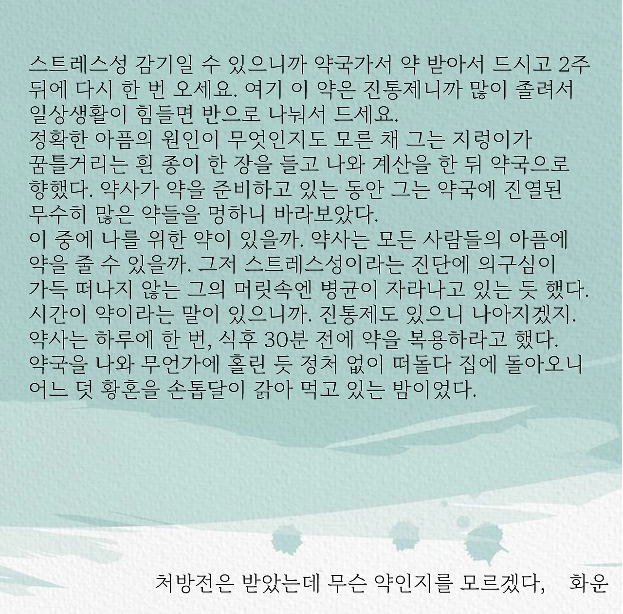 이 중에 나를 위한 약이 있을까. 약사는 모든 사람들의 아픔에 약을 줄 수 있을까. 그저 스트레스성이라는 진단에 의구심이 가득 떠나지 않는 그의 머릿속엔 병균이 자라나고 있는 듯 했다.