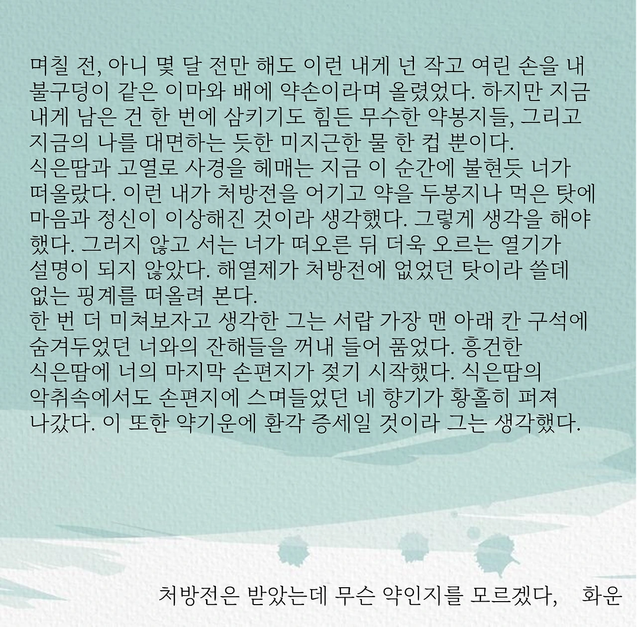 한 번 더 미쳐보자고 생각한 그는 서랍 가장 맨 아래 칸 구석에 숨겨두었던 너와의 잔해들을 꺼내 들어 품었다. 흥건한 식은땀에 너의 마지막 손편지가 젖기 시작했다. 식은땀의 악취속에서도 손편지에 스며들었던 네 향기가 황홀히 퍼져 나갔다. 이 또한 약기운에 환각 증세일 것이라 그는 생각했다.