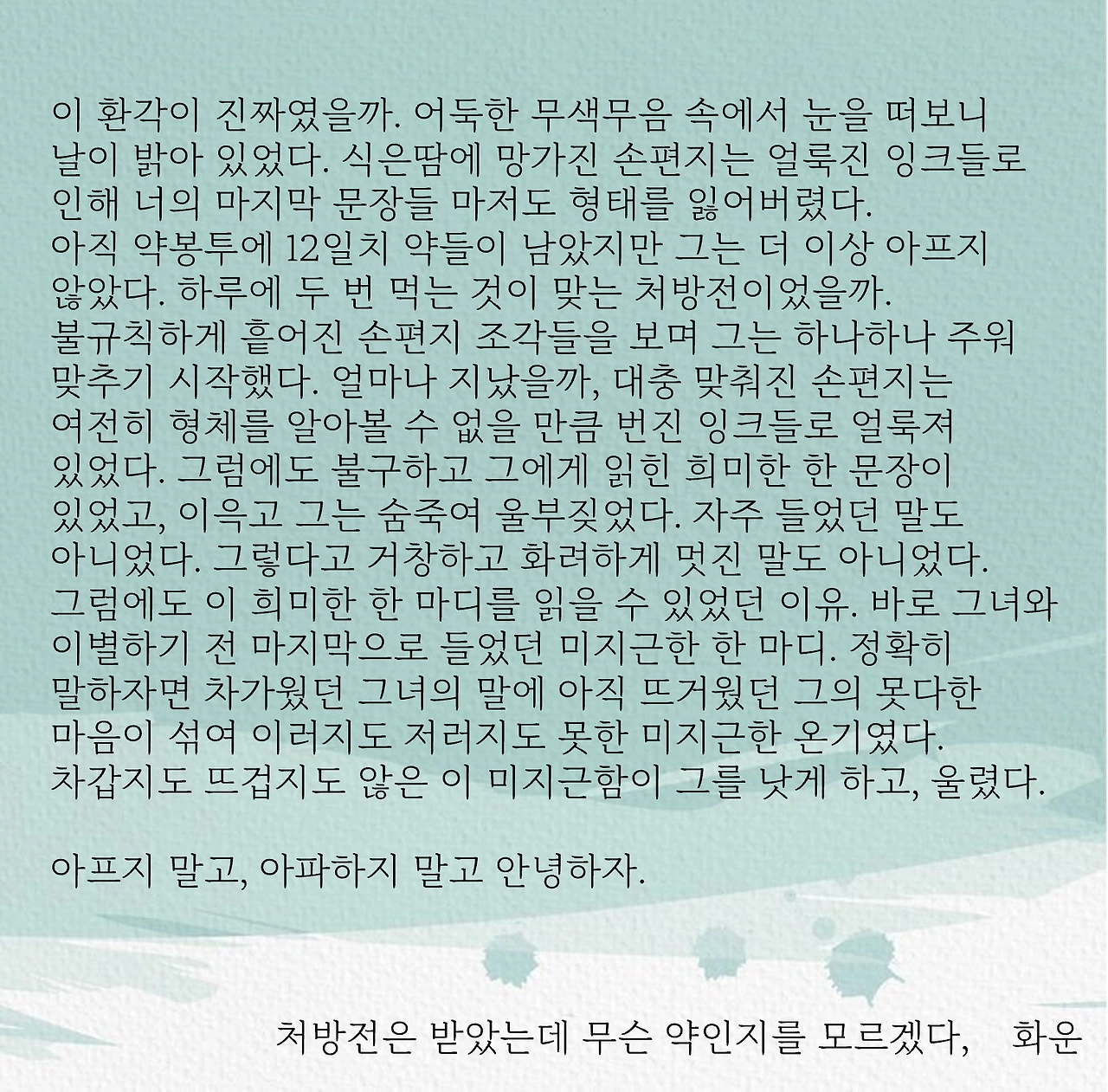 아직 약봉투에 12일치 약들이 남았지만 그는 더 이상 아프지 않았다. 하루에 두 번 먹는 것이 맞는 처방전이었을까. 불규칙하게 흩어진 손편지 조각들을 보며 그는 하나하나 주워 맞추기 시작했다. 얼마나 지났을까, 대충 맞춰진 손편지는 여전히 형체를 알아볼 수 없을 만큼 번진 잉크들로 얼룩져 있었다. 그럼에도 불구하고 그에게 읽힌 희미한 한 문장이 있었고, 이윽고 그는 숨죽여 울부짖었다. 자주 들었던 말도 아니었다. 그렇다고 거창하고 화려하게 멋진 말도 아니었다. 그럼에도 이 희미한 한 마디를 읽을 수 있었던 이유. 바로 그녀와 이별하기 전 마지막으로 들었던 미지근한 한 마디. 정확히 말하자면 차가웠던 그녀의 말에 아직 뜨거웠던 그의 못다한 마음이 섞여 이러지도 저러지도 못한 미지근한 온기였다. 차갑지도 뜨겁지도 않은 이 미지근함이 그를 낫게 하고, 울렸다.