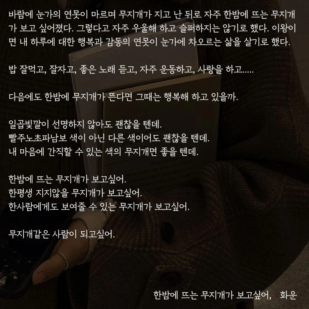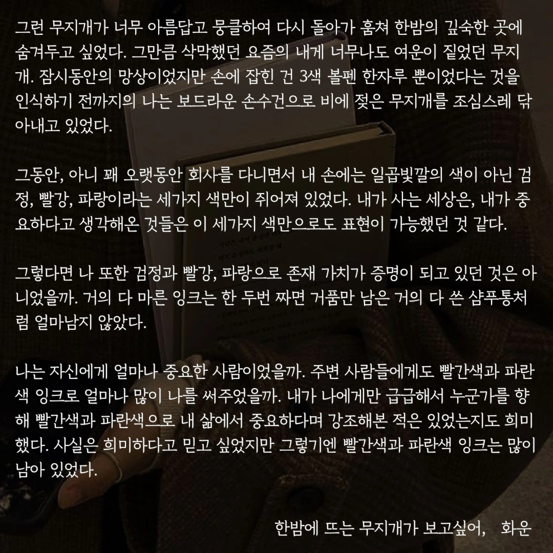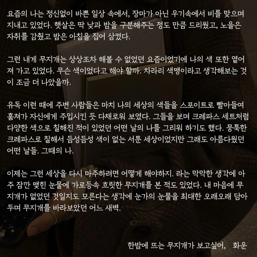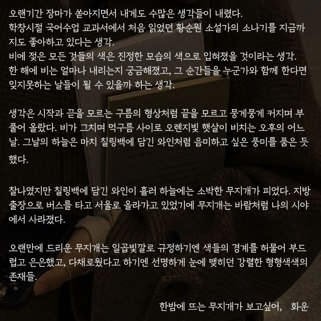 우연히 한 문장, 한 글자 주의 깊게 바라보았습니다. 그 우연이 제 삶에 길을 내어주었습니다. 제 글이 구름처럼 언제든 볼 수 있지만 깊이 있고 위로가 될 수 있으면 좋겠습니다
