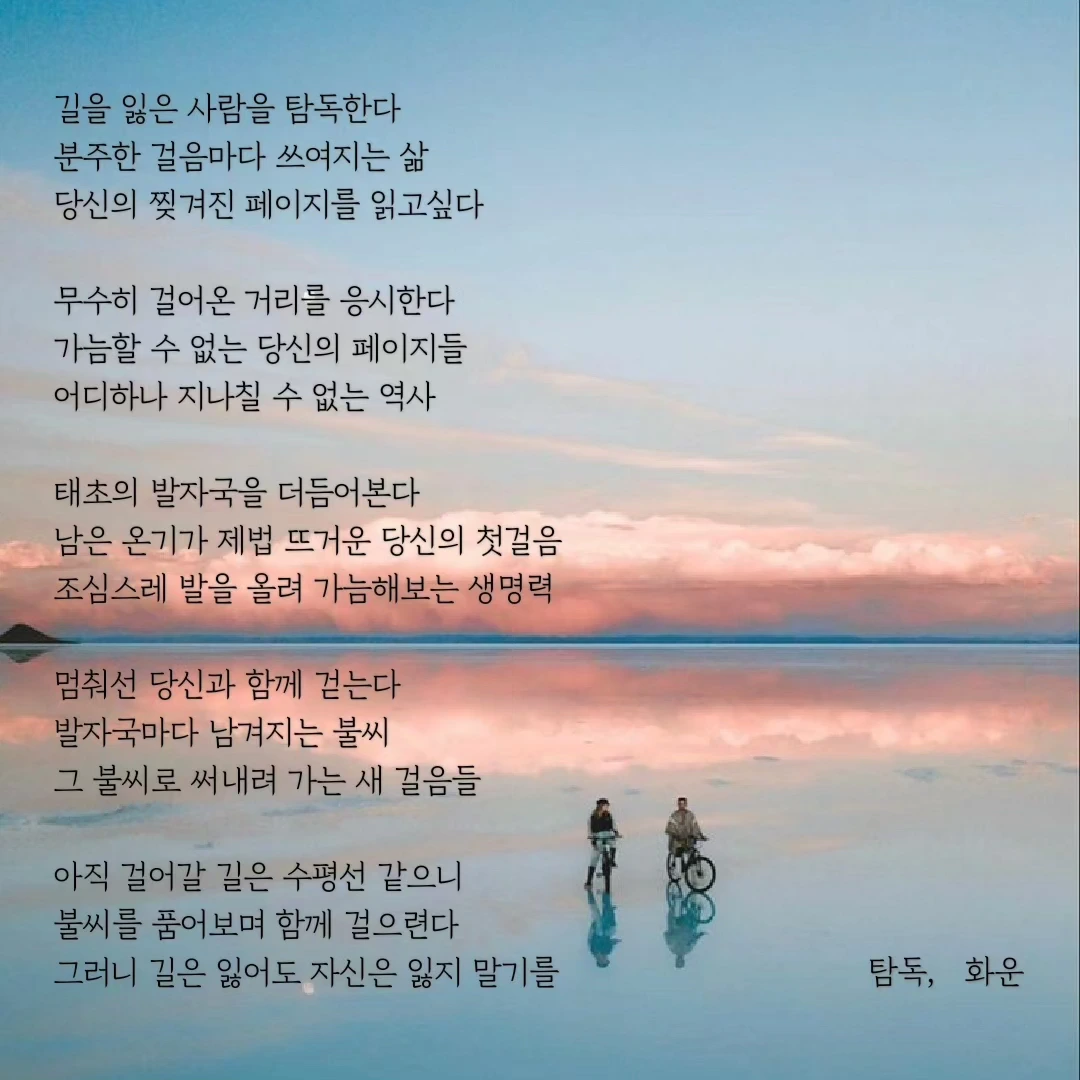 우연히 한 문장, 한 글자 주의 깊게 바라보았습니다. 그 우연이 제 삶에 길을 내어주었습니다. 제 글이 구름처럼 언제든 볼 수 있지만 깊이 있고 위로가 될 수 있으면 좋겠습니다