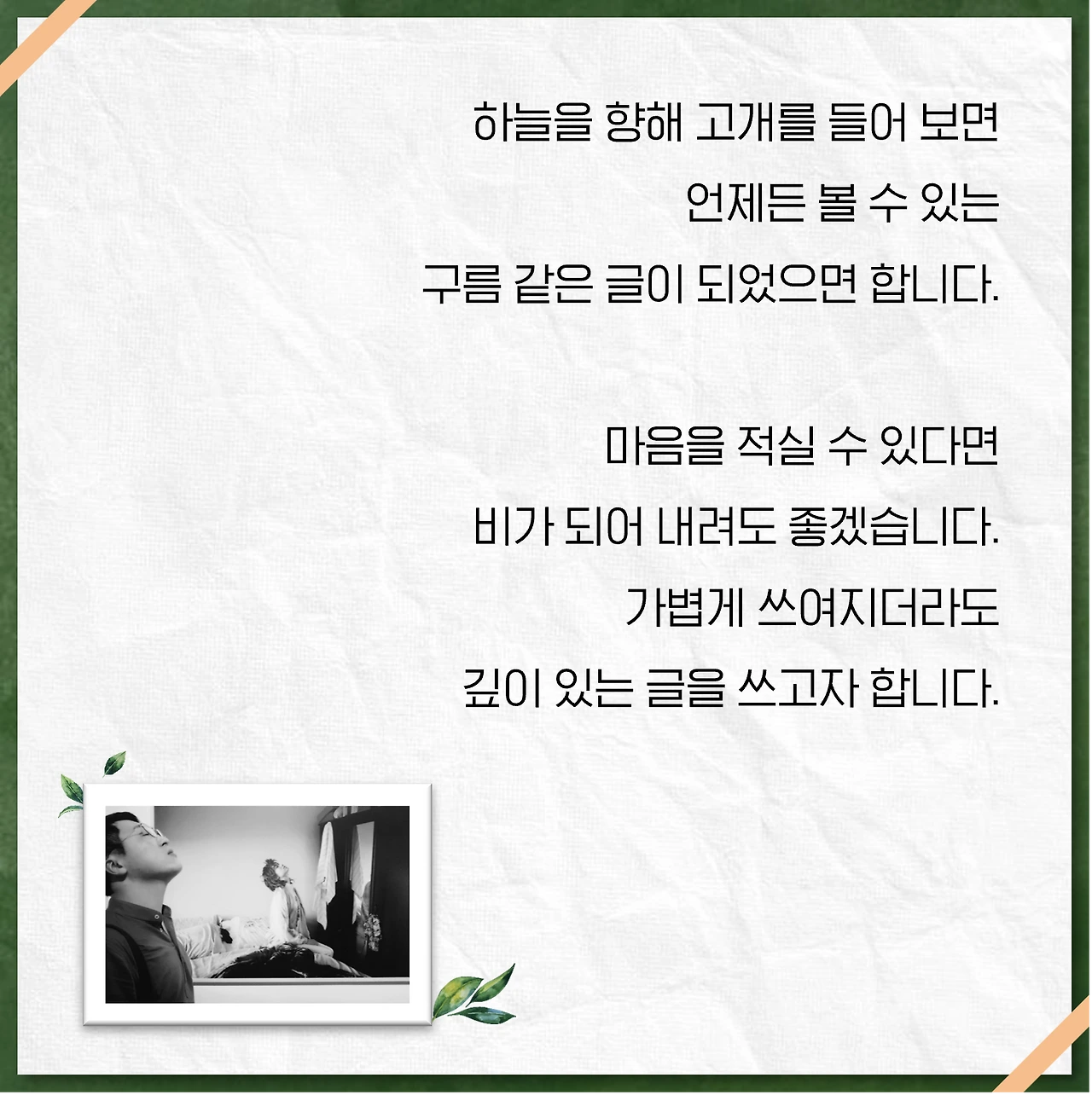우연히 한 문장, 한 글자 주의 깊게 바라보았습니다. 그 우연이 제 삶에 길을 내어주었습니다. 제 글이 구름처럼 언제든 볼 수 있지만 깊이 있고 위로가 될 수 있으면 좋겠습니다