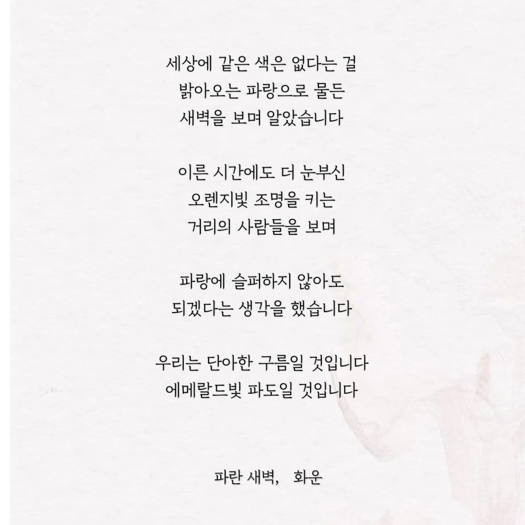 우연히 한 문장, 한 글자 주의 깊게 바라보았습니다. 그 우연이 제 삶에 길을 내어주었습니다. 제 글이 구름처럼 언제든 볼 수 있지만 깊이 있고 위로가 될 수 있으면 좋겠습니다