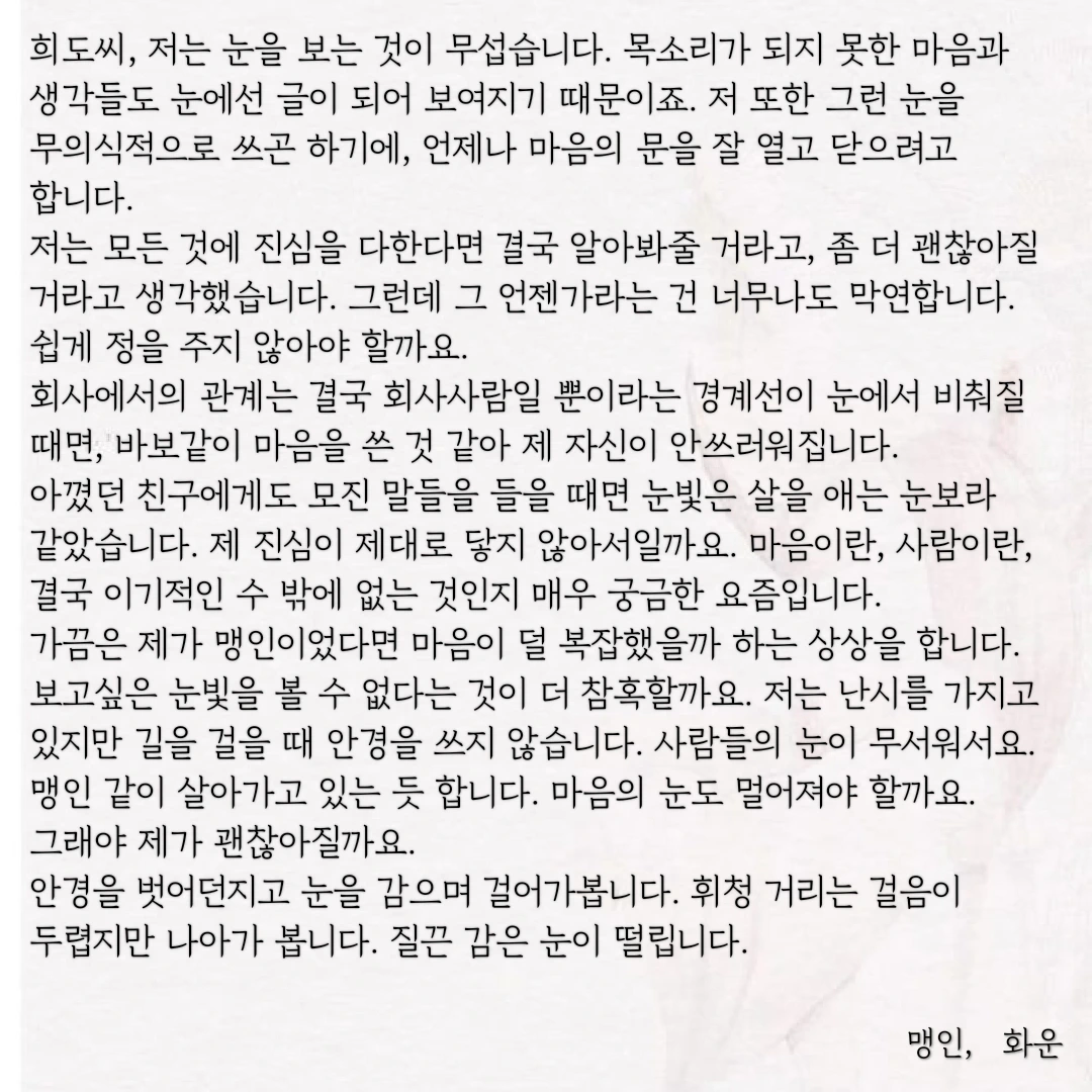 희도씨, 저는 눈을 보는 것이 무섭습니다. 목소리가 되지 못한 마음과 생각들도 눈에선 글이 되어 보여지기 때문이죠. 저 또한 그런 눈을 무의식적으로 쓰곤 하기에, 언제나 마음의 문을 잘 열고 닫으려고 합니다.