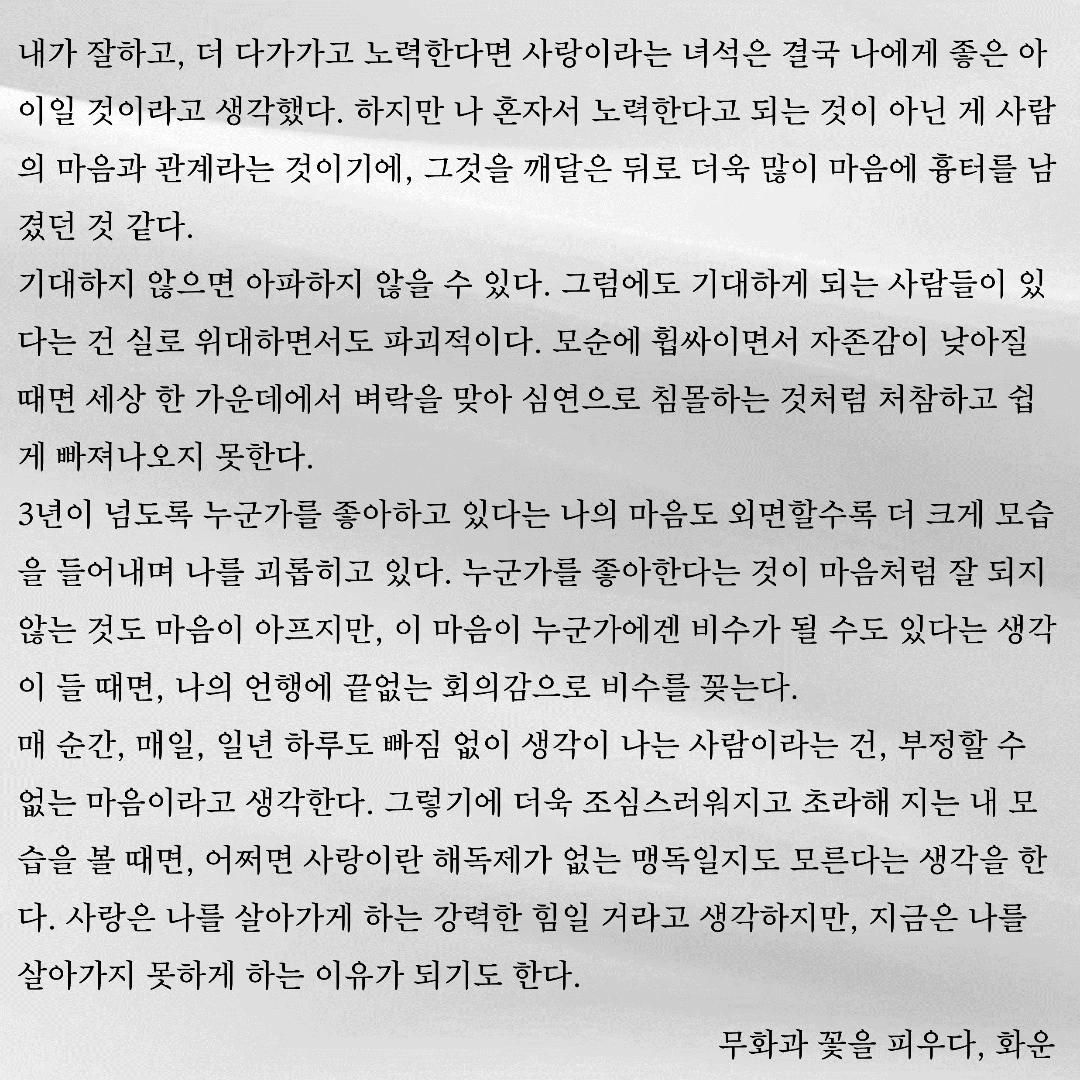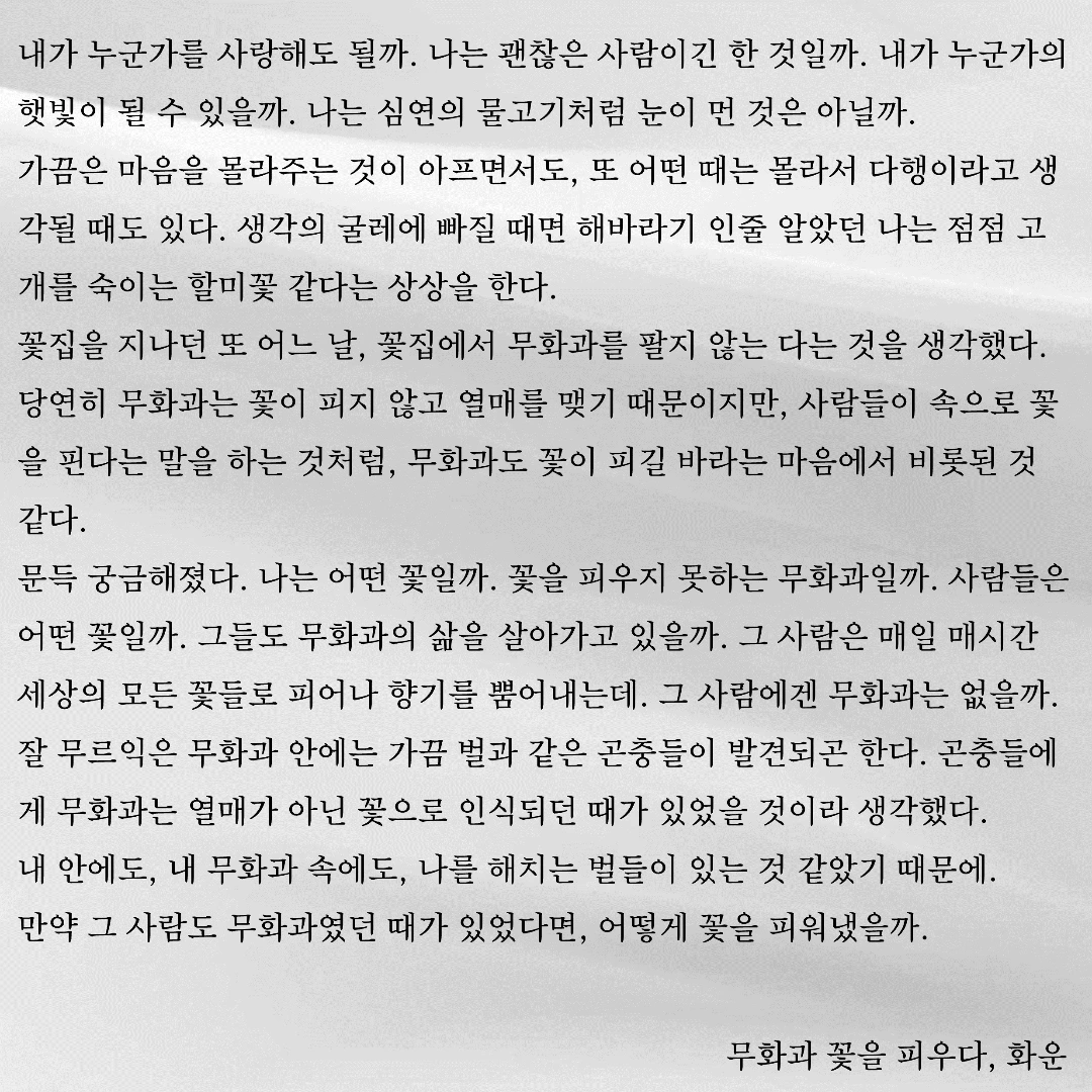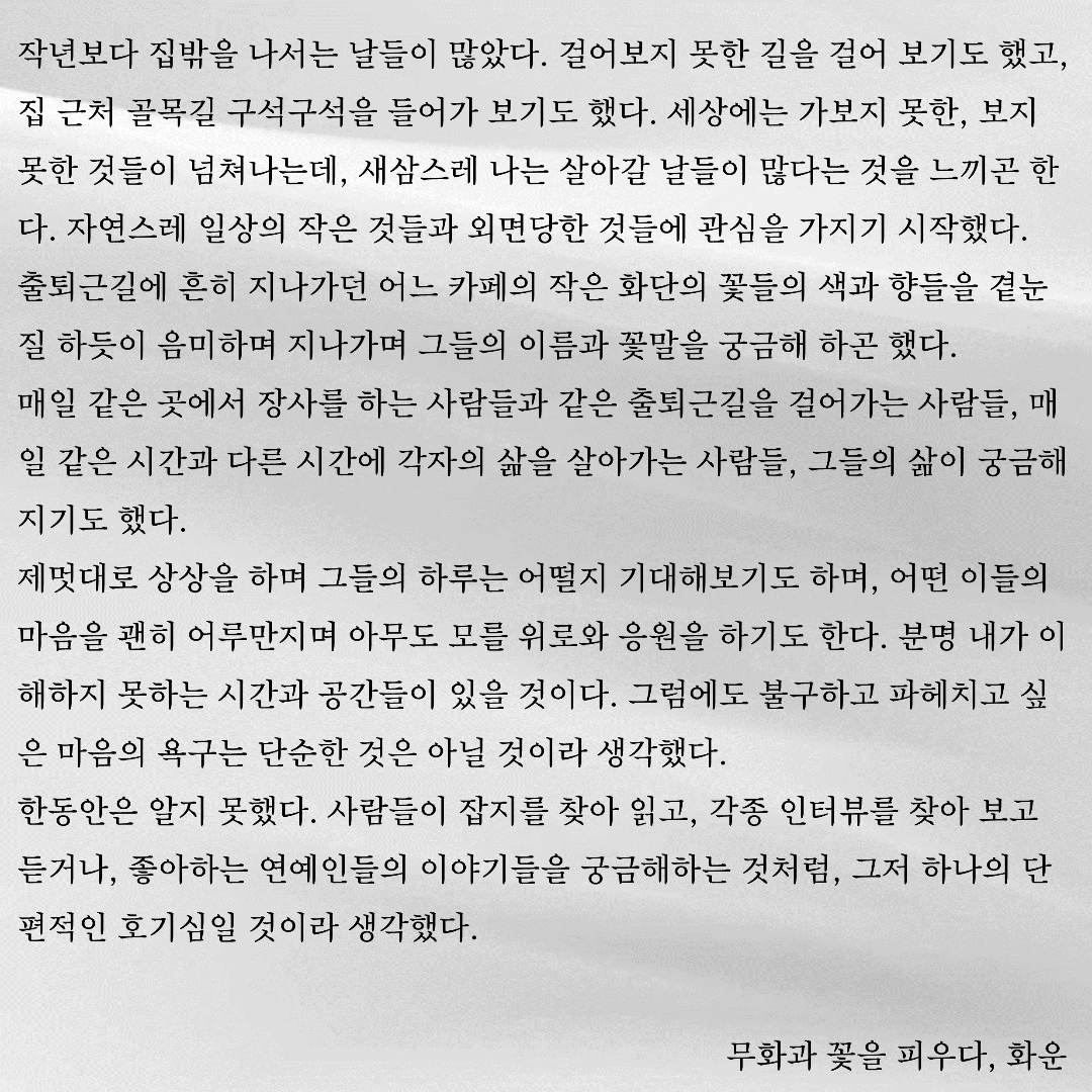 우연히 한 문장, 한 글자 주의 깊게 바라보았습니다. 그 우연이 제 삶에 길을 내어주었습니다. 제 글이 구름처럼 언제든 볼 수 있지만 깊이 있고 위로가 될 수 있으면 좋겠습니다