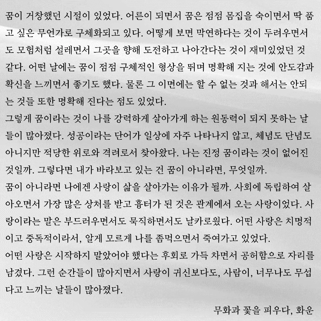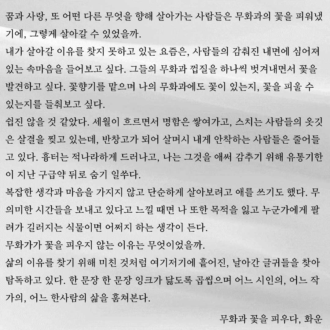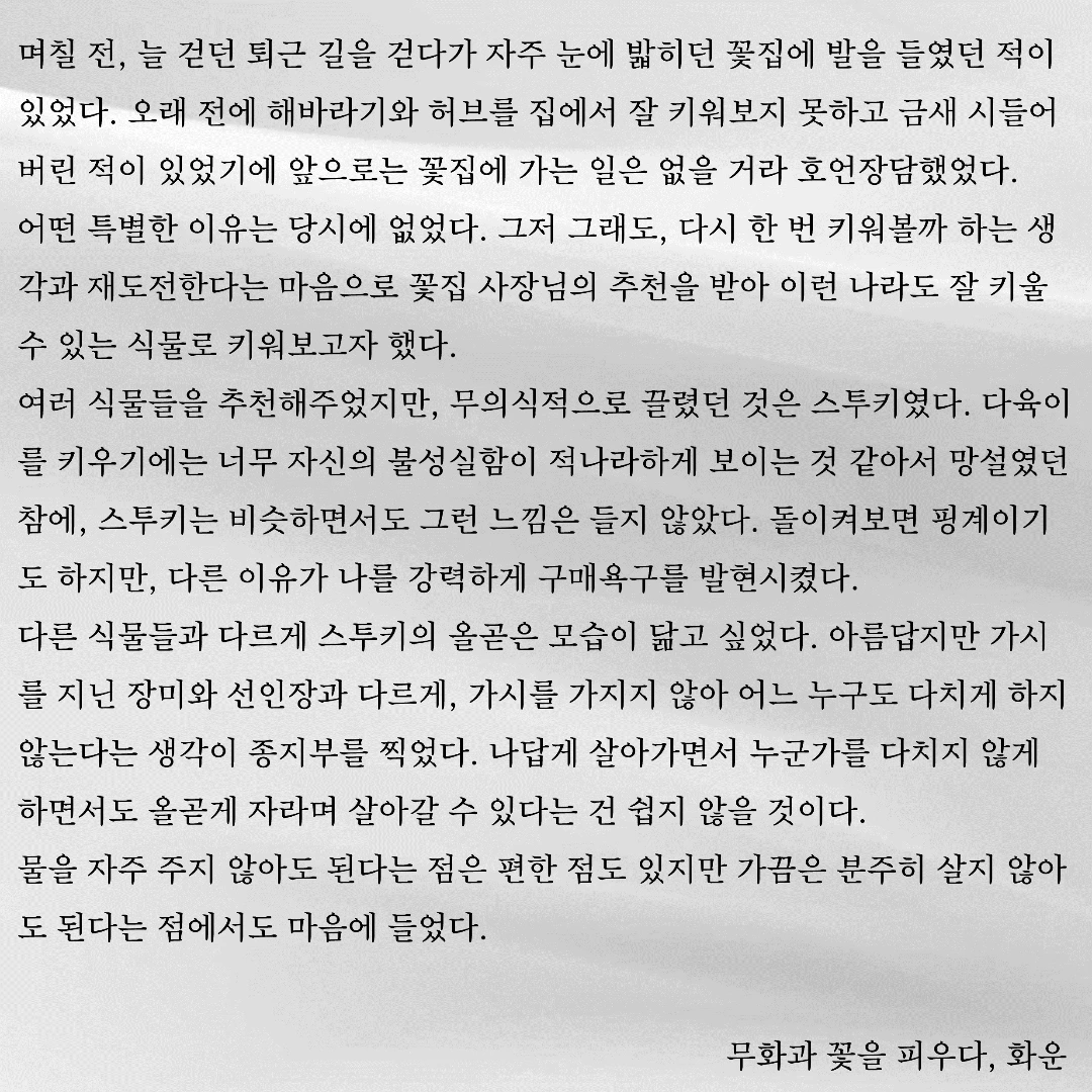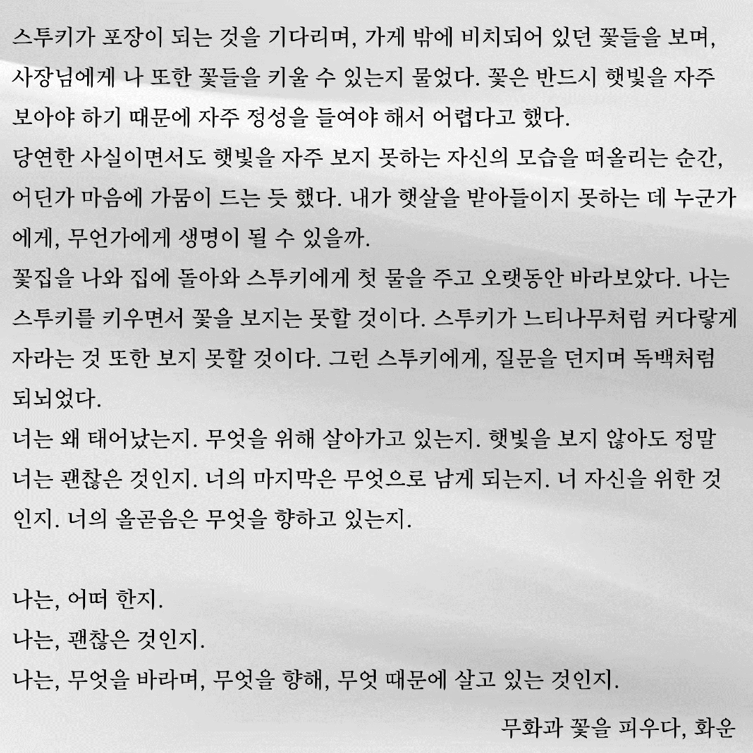 우연히 한 문장, 한 글자 주의 깊게 바라보았습니다. 그 우연이 제 삶에 길을 내어주었습니다. 제 글이 구름처럼 언제든 볼 수 있지만 깊이 있고 위로가 될 수 있으면 좋겠습니다